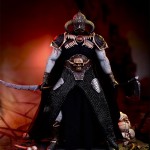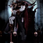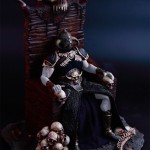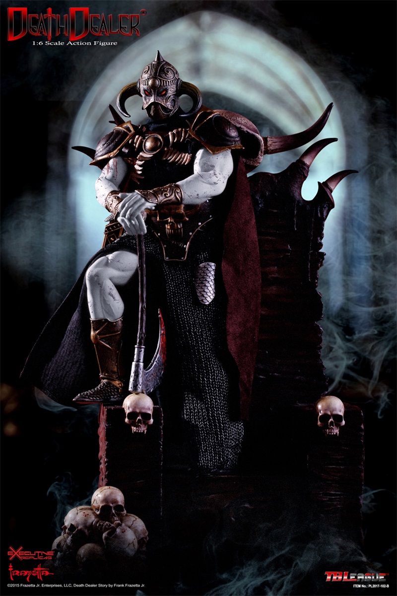 The Death Dealer stands enormous, draped with a chain-link skirt, a dark cloak, and a horned helmet. His eyes burn like fire and no one is certain of his origin. It is told that he is as old as time itself. - – Throne