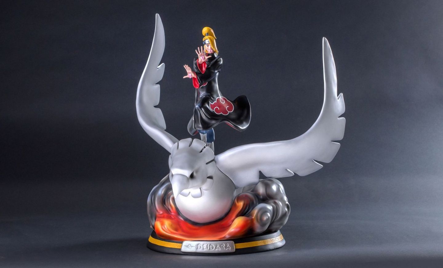 The HQS statue of Deidara himself is very detailed. Each hand is perfectly sculpted with its extra mouth from which spurt out a tongue as a deadly threat to its opponent. His look angled down expresses exactly his despise for anybody and his superiority feeling. Lastly, blown by the explosion, his Akatsuki patterned coat is seething under the wind, bringing some dynamism to Deidara’s pose.