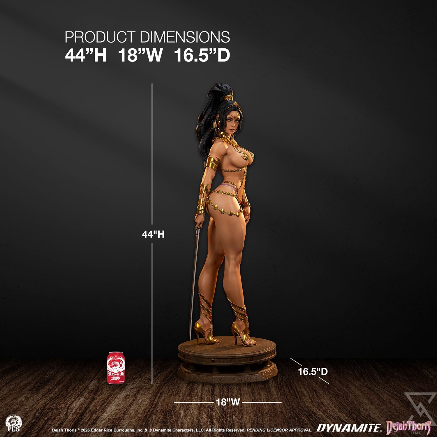 This fully sculpted 1:2 scale statue stands nearly 44” tall and portrays the proud regent as she strides confidently with her sword in hand. Keeping to the Martian custom, Dejah shuns traditional clothing, instead adorning herself with an assortment of ornate gold jewelry. The design of her jewelry seems otherworldly as well, its organic swirls and arcs conforming neatly to Dejah’s shape. Vibrant red gemstones complement the princess’ attire from her tiara to her sandals adding to her regal appearance.
