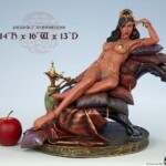 The Dejah Thoris Premium Format™ Figure measures 14” tall and 16” wide as the red Martian royalty lounges on a chaise decorated with sumptuous sculpted sleeping silks. The floor of her private room depicts a detailed map of the alien world of Barsoom, or Mars to us Earthlings. Colored stones denote the various cities of the world, the largest of which marks Dejah’s own empire of Helium.