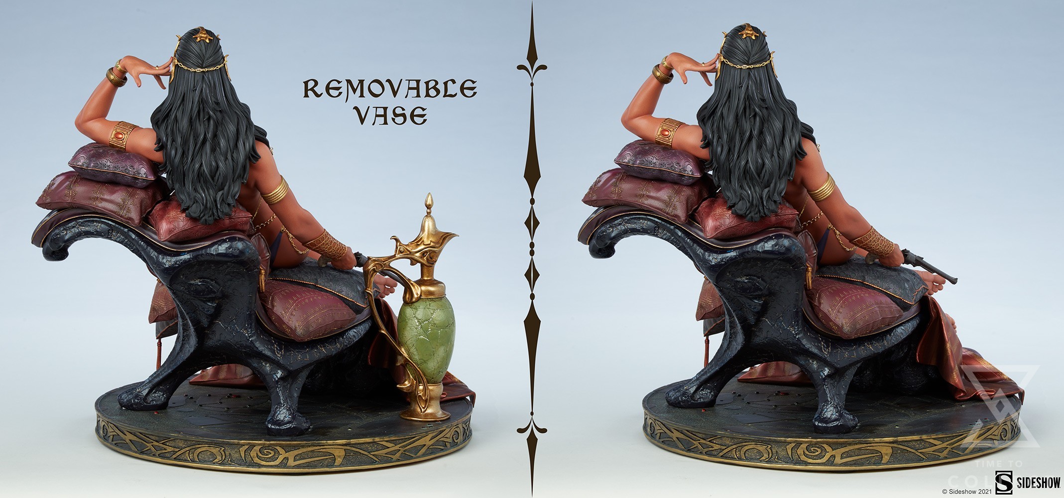 The Dejah Thoris Premium Format™ Figure is a vision of regal beauty, sculpted in polystone and draped in metal chain jewelry that is customary of the inhabitants of Barsoom. The Princess of Helium is also adorned in a number of highly-wrought ornaments, from her golden bracelets and earrings to her jeweled crown. Dejah Thoris is a capable adventurer in her own right and comes armed with a radium pistol as she awaits the arrival of John Carter. An ornate Martian vase can be placed on the base alongside the figure or removed as desired, adding to the environment of the strange desert planet.