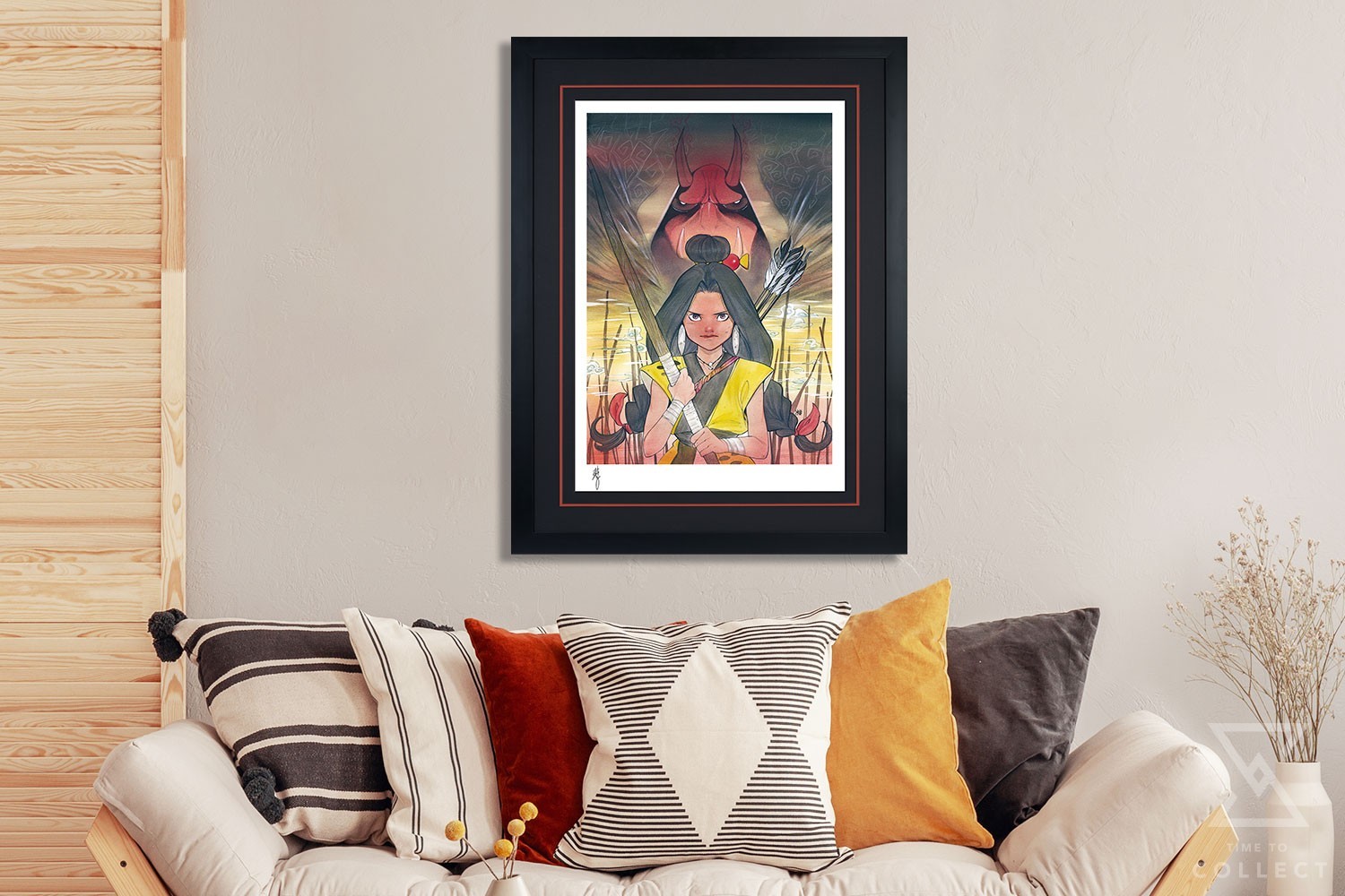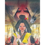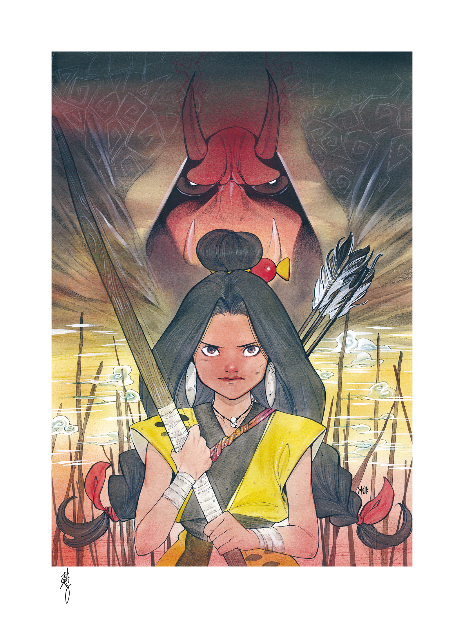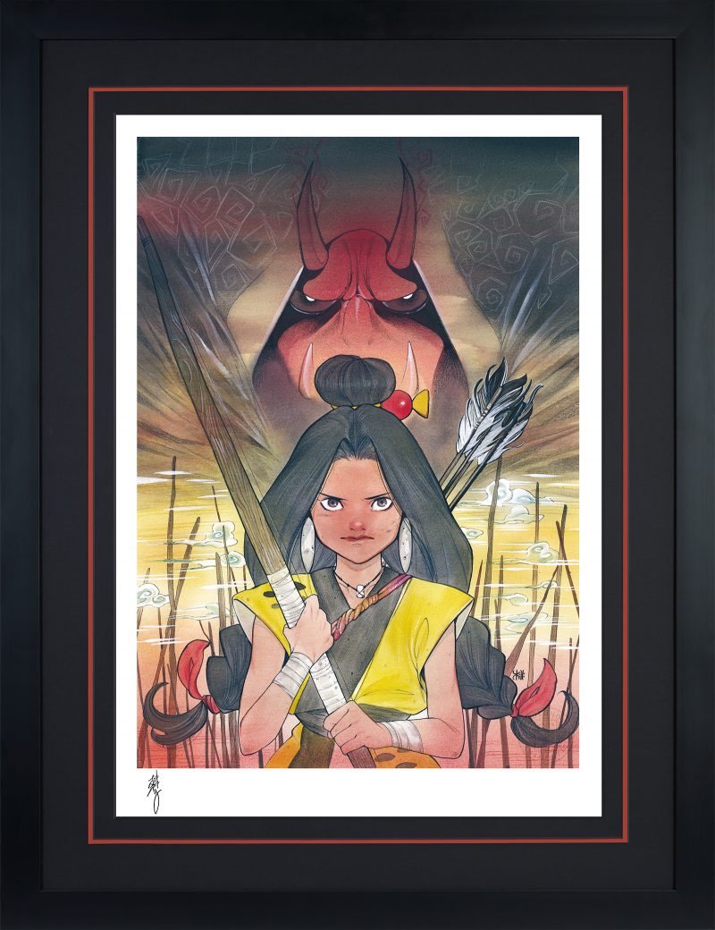 In her Marvel Comics writing and interior art debut, superstar artist Peach Momoko transported fans and their favorite characters into the realm of Japanese folklore with the creation of the Demon Days prestige series. This fierce portrait reimagines the fearless mutant Dani Moonstar as Tsuki, the young archer defending her village against monsters. Looming large behind her, the infamous Red Hulk takes on the demonic appearance of an Aka Oni, ogre-like and just as angry as ever. Finished with thematic coloring and elements of nature, this imaginative painting puts a new perspective on beloved classics.