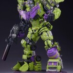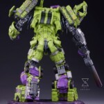 Armed with an appropriately oversized blaster in his right hand, Devastator is poised on a low-profile Decepticon themed base. Decorated in shades of purple with sleek futuristic finishes, the base offers a museum style display without sacrificing detail.