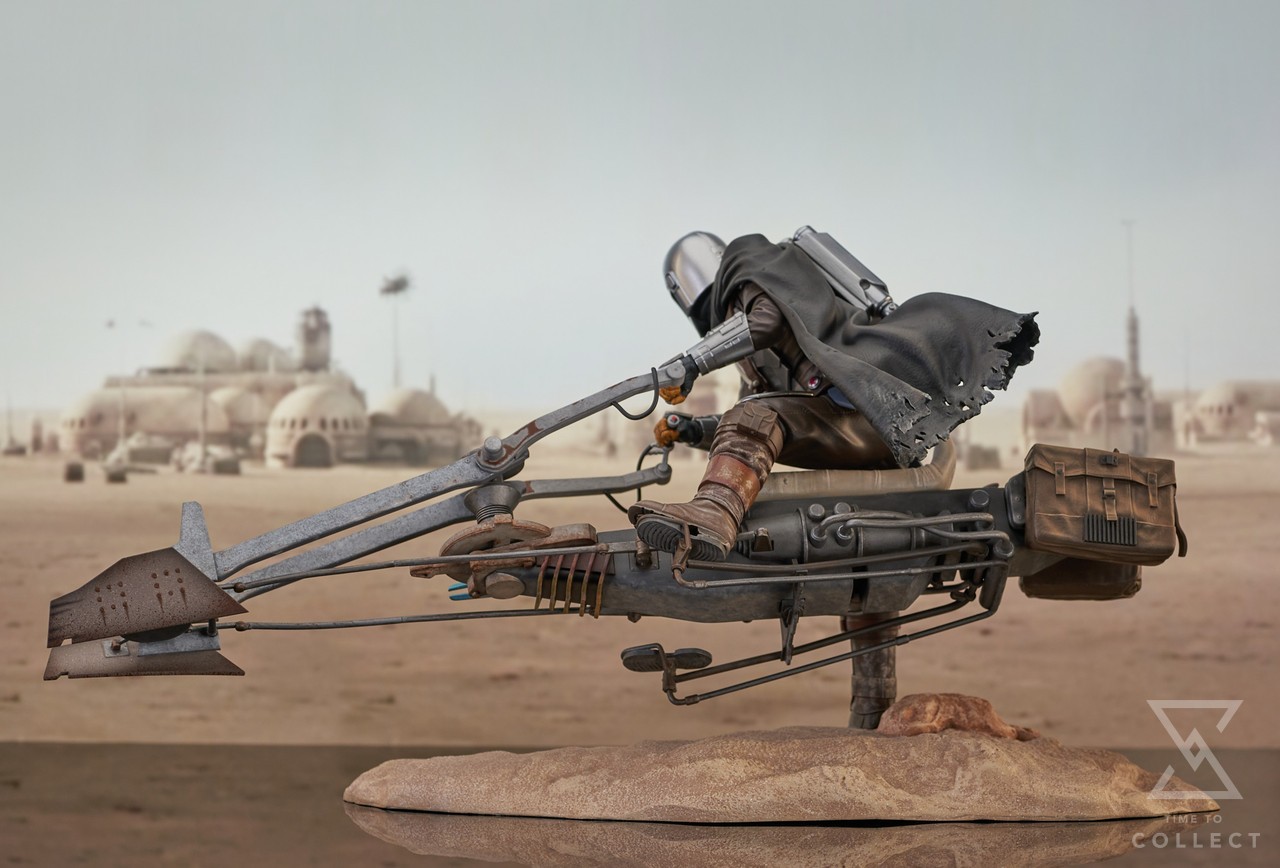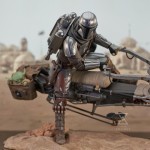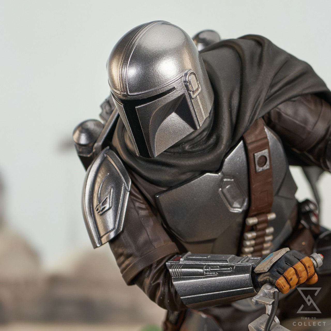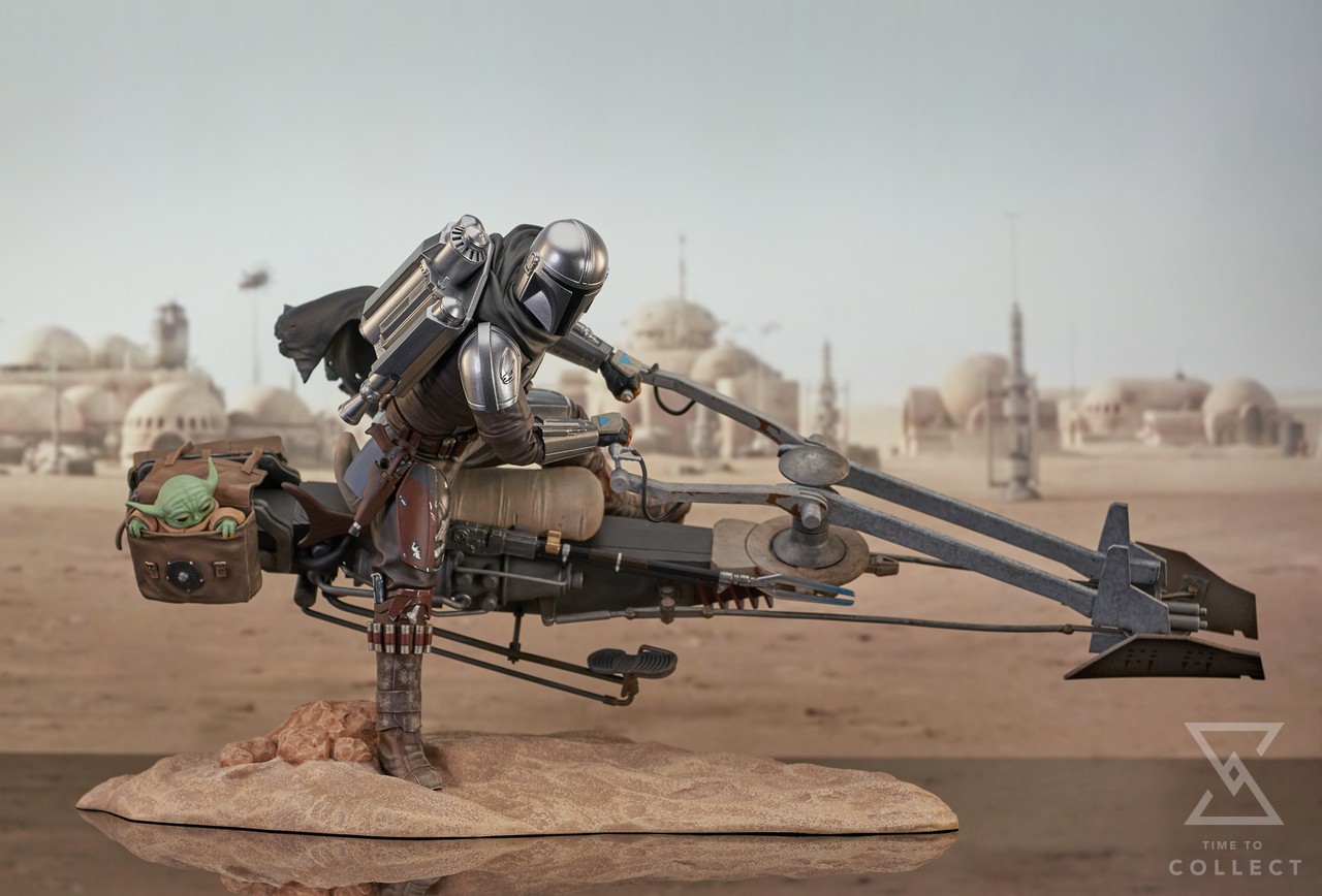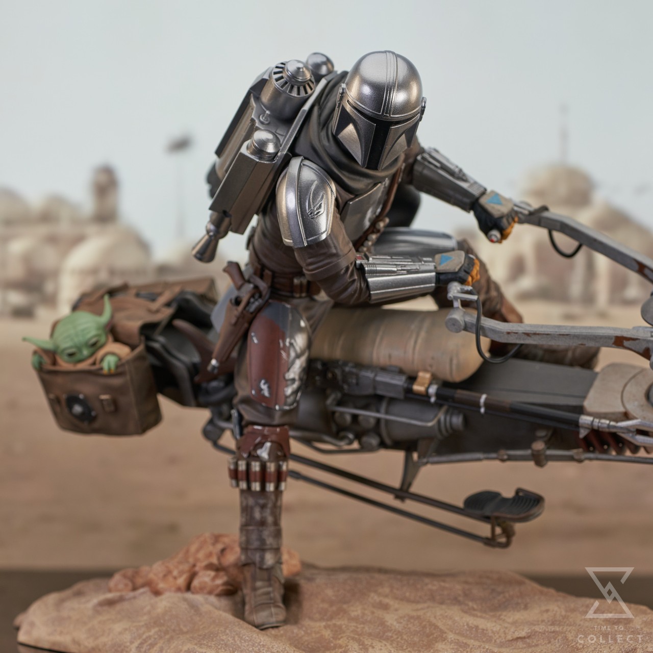 This is the big one! At 9 inches tall and over a foot long, this 1/7 scale statue of Din Djarin astride a speeder bike is the crown jewel in any Mandalorian statue collection. With Grogu hanging out of a pouch on the back of the bike, and one of Din’s feet touching the ground to pivot his attack, this statue is limited to only 1000 pieces and comes packaged with a numbered certificate of authenticity in a full-color box.