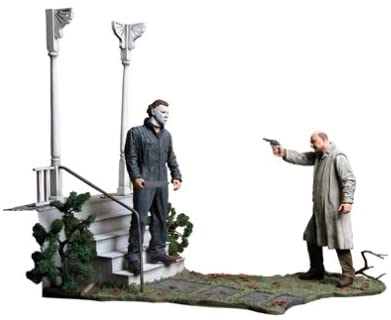 NECA presents new images of their upcoming Halloween “The Night He Came Home…” deluze boxed set. recreating the scene “The Night He Came Home” from the orginal Halloween movie, we see the battle of good and evil waged between Michael Myers and Dr. Loomis. The diorama bases allow the figures to be posed seperately or together to form a larger scene spanning over 17″ in length. Dr. Loomis presented for the first time in action figure form is fully poseable and comes complete with pistol. Michael Myers features a ball-jointed neck and shoulders and comes complete with his trademark knife. Incredible movie accurate detail brings to life the from porch and yard of the Myers home including a lited pumpkin on the porch rail which we think is a real nice touch.