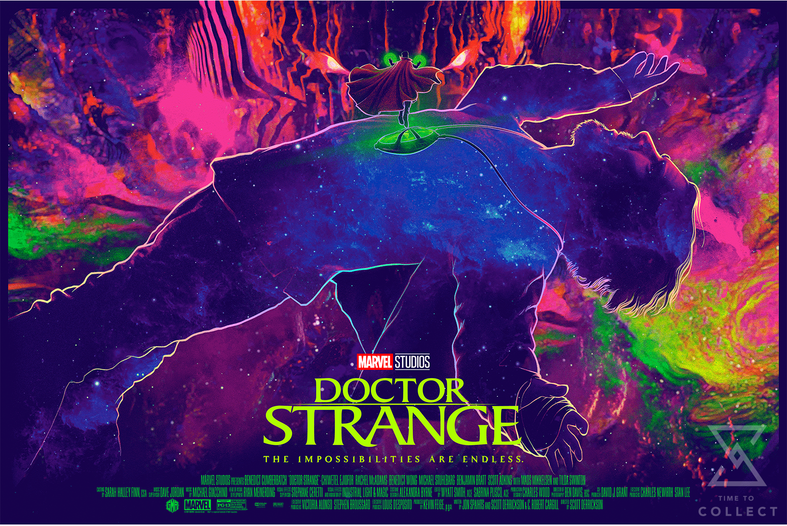 In this edition, the ascension of Doctor Strange is highlighted through vibrant pink and purple tones lining his weightless form as he blends seamlessly into the universe.