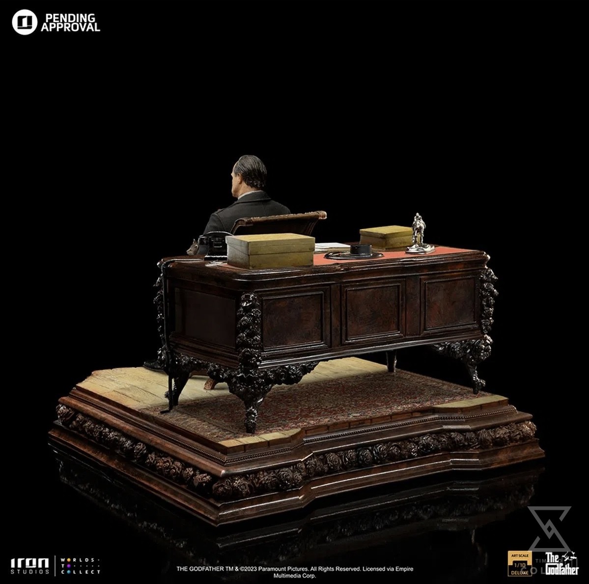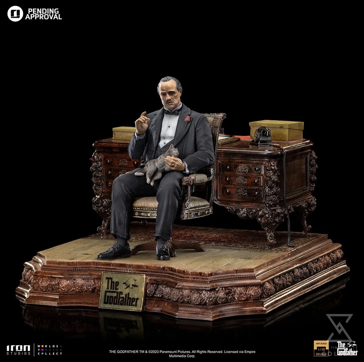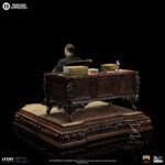In the summer of 1945, the admired, respected, and many times feared patriarch leader of a Sicilian-American family introduces himself while sat in his classic office chair made with noble antique wood, holding his pet cat on his lap. Formally wearing a tuxedo with a red rose on the lapel specially for his daughter’s wedding, he patiently hears the requests of his allies during an intermission, inside of his hidden office in his New York mansion. With a set filled with details such as his old colonial desk on the back with a lot of carvings on the side, feet, and drawers, with a black rotary dial telephone over the desk next to a box of cigars and other accessories, Iron Studios present their statue “Don Vito Corleone – The Godfather – Deluxe Art Scale 1/10”, with the main character of one of the greatest and most influential movies ever made, the first of the cinematic trilogy and successful franchise, known as a milestone in the gangster genre, influencing new productions to this very day.