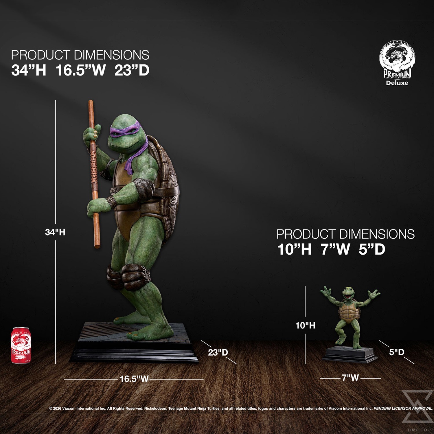 Standing an impressive 34” tall, the Donatello 1:2 statue is sculpted in incredible detail from the textured reptilian pattern of his skin to the realistic leather like appearance of his belt, knee and elbow pads. The sculpted details are made even more apparent by the excellent paint work throughout. Woodgrain finishes on Donatello’s bo staff and realistic glass eyes add additional depth to this piece and tie in nicely with the clean finish of the museum style base.