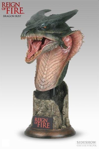 The Reign of Fire Dragon Bust Maquette stands 2 feet tall atop a detailed display base inspired by the ruined castle used as a last line of defense by the hero characters in the film. The bust is cast in fiberglass and polystone, while the spines and teeth are cast in durable ABS plastic to avoid breakage. Each piece is hand finished and hand painted to exacting standards. This bust is sure to be the crown jewel of any dragon, fantasy, or film enthusiast’s collection.