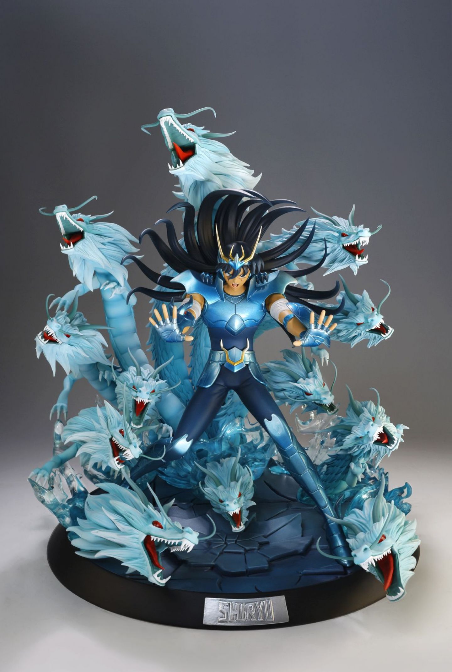 Shiryu’s base is a set-up of his 100 rising dragons attack. It mimics a floor broken by the violence of the attack. Blue waves of cosmo energy are made in translucent resinand 12 dragons spring all around him just as they do in the manga or the anime show. Composition of the base and placement of the dragons was a very precise job. The goal was to emphasize the movement and the magnitude of the attack while keeping some space so your eyes can lay on the numerous details of this incredible statue.