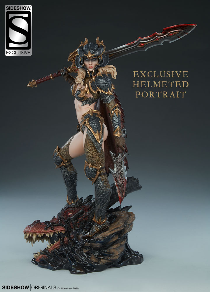 The Exclusive Edition of the Dragon Slayer: Warrior Forged in Flame Statue includes a swap-out helmeted portrait, as our hero dons the Dragonhorn Helm to protect herself even further against the onslaught of fire. Crafted from the same horns as her body armor, this exclusive display option gives the slayer an even more legendary look in your collection.