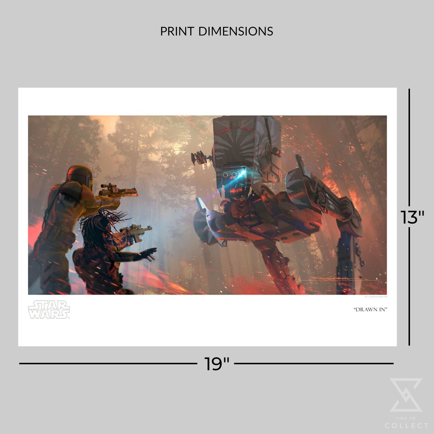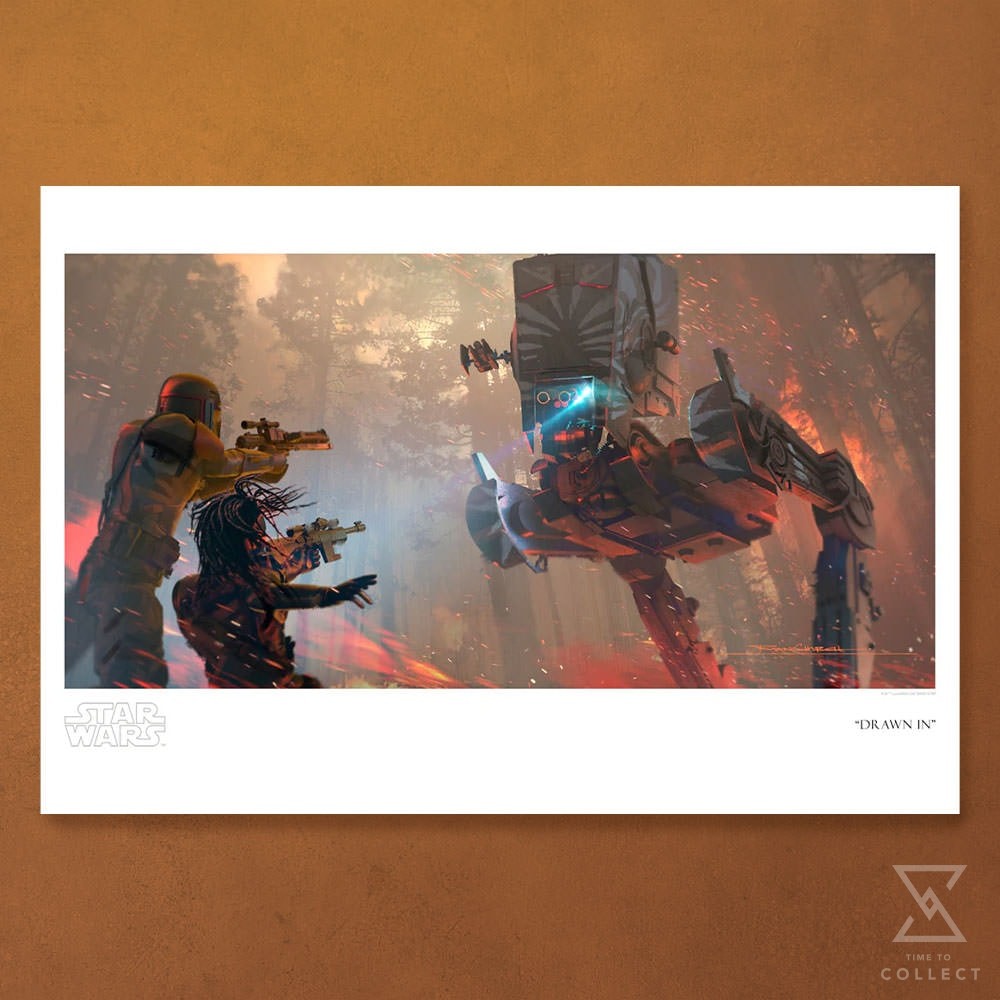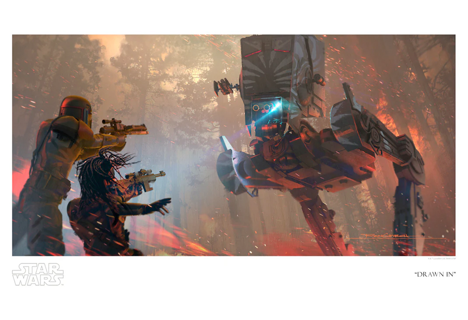 See a terrifying AT-ST be brought to its knees in this intense Star Wars artwork inspired by Star Wars: The Mandalorian end-credit concept art. Each fine art giclee print is hand-numbered from a limited edition of 125 pieces and comes with a Certificate of Authenticity.