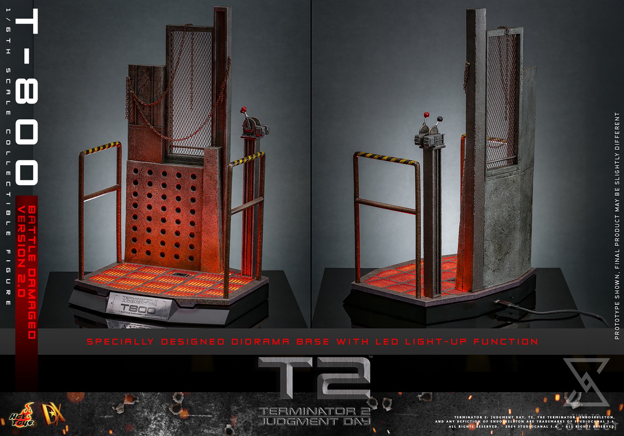 The faithfully crafted battle-damaged version of the T-800 Sixth Scale Figure features a newly developed head sculpt with separate rolling eyeball, as well as an additional heavily damaged head sculpt revealing the endoskeleton with an LED light-up right eye; a meticulously tailored costume featuring jackets made in genuine leather (a battle damaged version and an additional one that is tattered on the left sleeve), a pair of pants also in genuine leather and a gray printed tee; weapons including a machine gun, a rifle, a pistol, a grenade launcher, a set of bullets and a rod; and lastly a specially designed steel mill themed diorama figure base that comes with LED function to replicate the iconic ending scene of the battle between T-800 and T-1000.