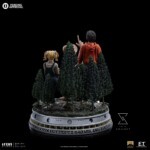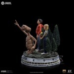 After a brief period of exile on Earth, the small and robust extra-terrestrial being with brown wrinkly skin and big blue eyes, points his long finger to the stars, indicating his rescue’s arrival. By his side, the boy Elliott and his younger sister Gertie, his friends, protectors, and hosts accompany his departure. Gertie brings in her small hands the flowerpot that the strange being from another world revived when they met, a gift she willingly accepted. Elliott, that shares a psychic connection with the alien, which makes their friendship bond even stronger, understands but suffers more with his departure. Another unforgettable and emblematic scene from one of the most praised and memorable works of the seventh art is reproduced by Iron Studios in the beautiful diorama statue “E.T., Elliot and Gertie – E.T. – Deluxe Art Scale 1/10”, over a base with the floor and the vegetation of the forest where everything takes place, with the edges decorated with themed elements that remind E.T.’s spaceship and the logo of the movie on the front.