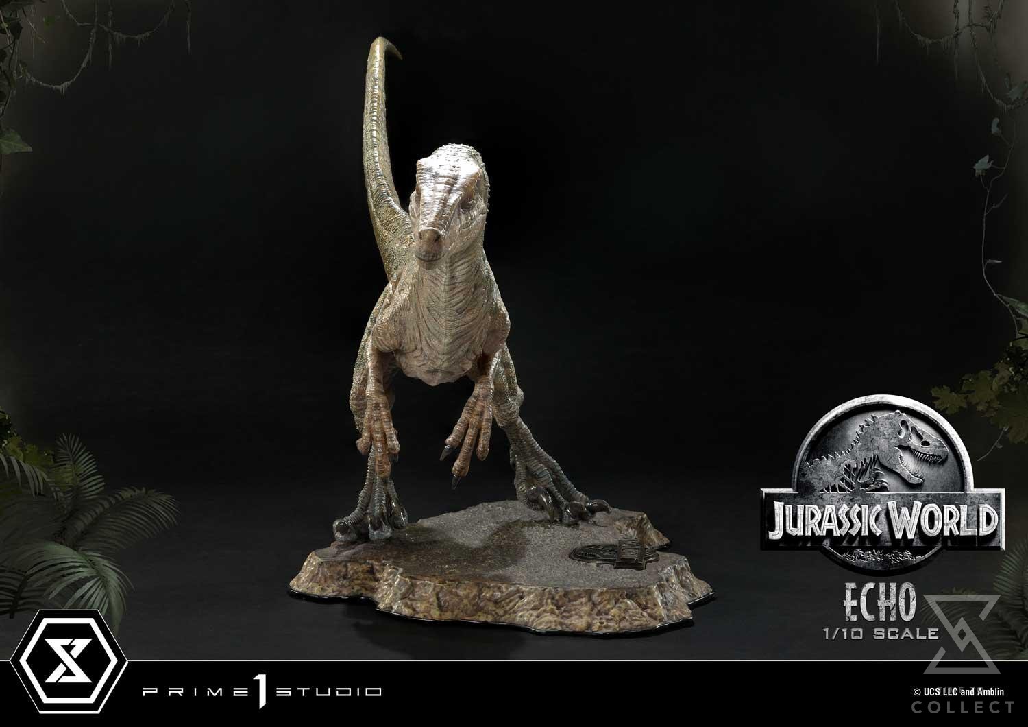 Echo stands ready to take cues from the pack leader on a Jurassic World-themed earthen base sporting a bronze-finished Jurassic World logo towards the front.
