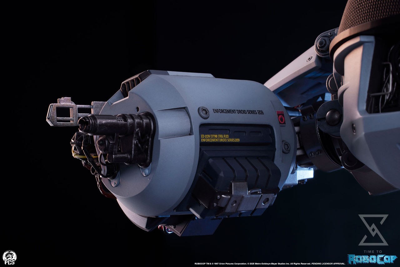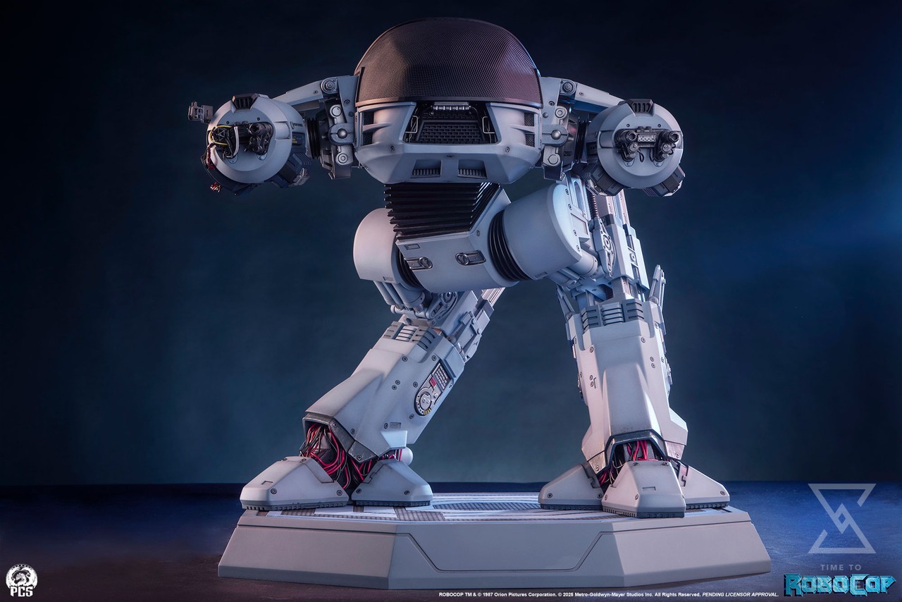 ED-209 stands atop a sleekly designed pedestal base featuring the OCP logo, armed and ready to pacify any perceived threat.