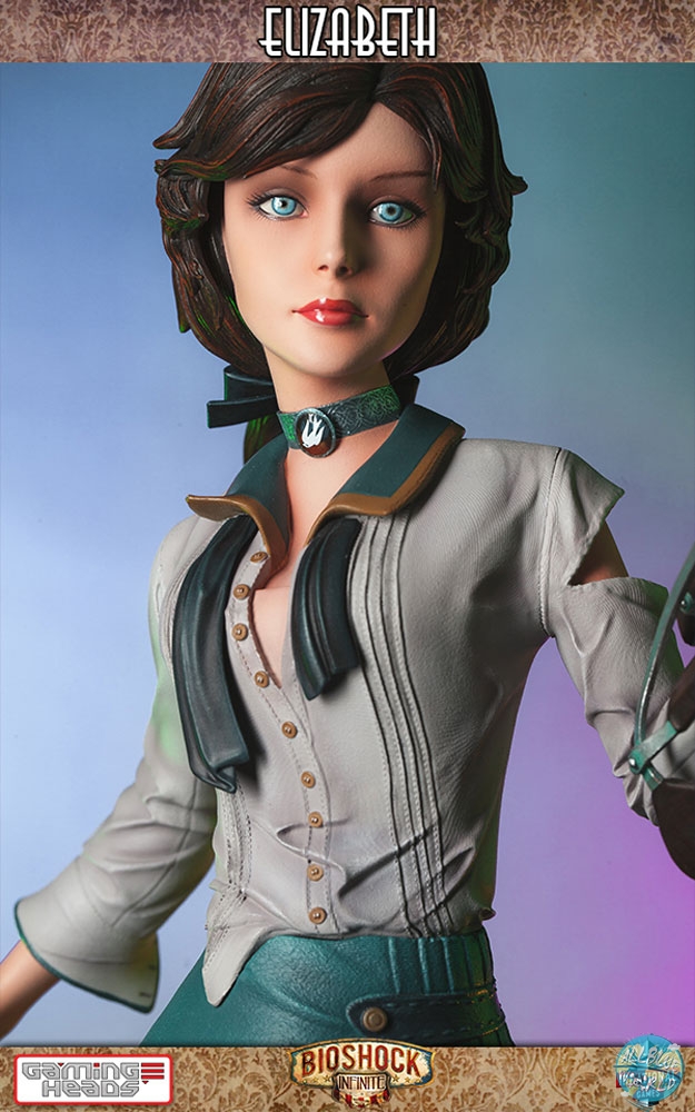 Normally accompanied by her trusty guardian, the Songbird, Elizabeth is Booker’s trusty companion as they venture through the city of Columbia, a city truly in the clouds. Her resourcefulness to pick locks, scrounge for resources as well as open tears proves to be invaluable to Booker throughout the entire duration of his stay. Wielding her trusty Sky-Hook, nowhere is inaccessible to Elizabeth, not even your home! Gaming Heads is proud to present the BioShock Infinite: Elizabeth Statue. Standing approximately 18 inches tall (i.e. 1/4 scale), carefully cast in polystone resin and hand-painted by artisans, the BioShock Infinite: Elizabeth Statue expertly captures her likeness in intricate detail from her ponytail down to her missing little finger.