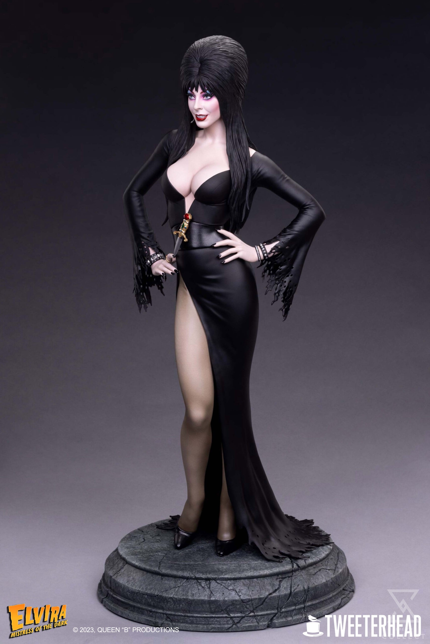 Tweeterhead is proud to present the Elvira 1:4 Scale Maquette, exclusive Smiling Edition – a masterpiece of collectible craftsmanship that pays homage to the legendary Cassandra Peterson and her iconic alter ego, Elvira: Mistress of the Dark!