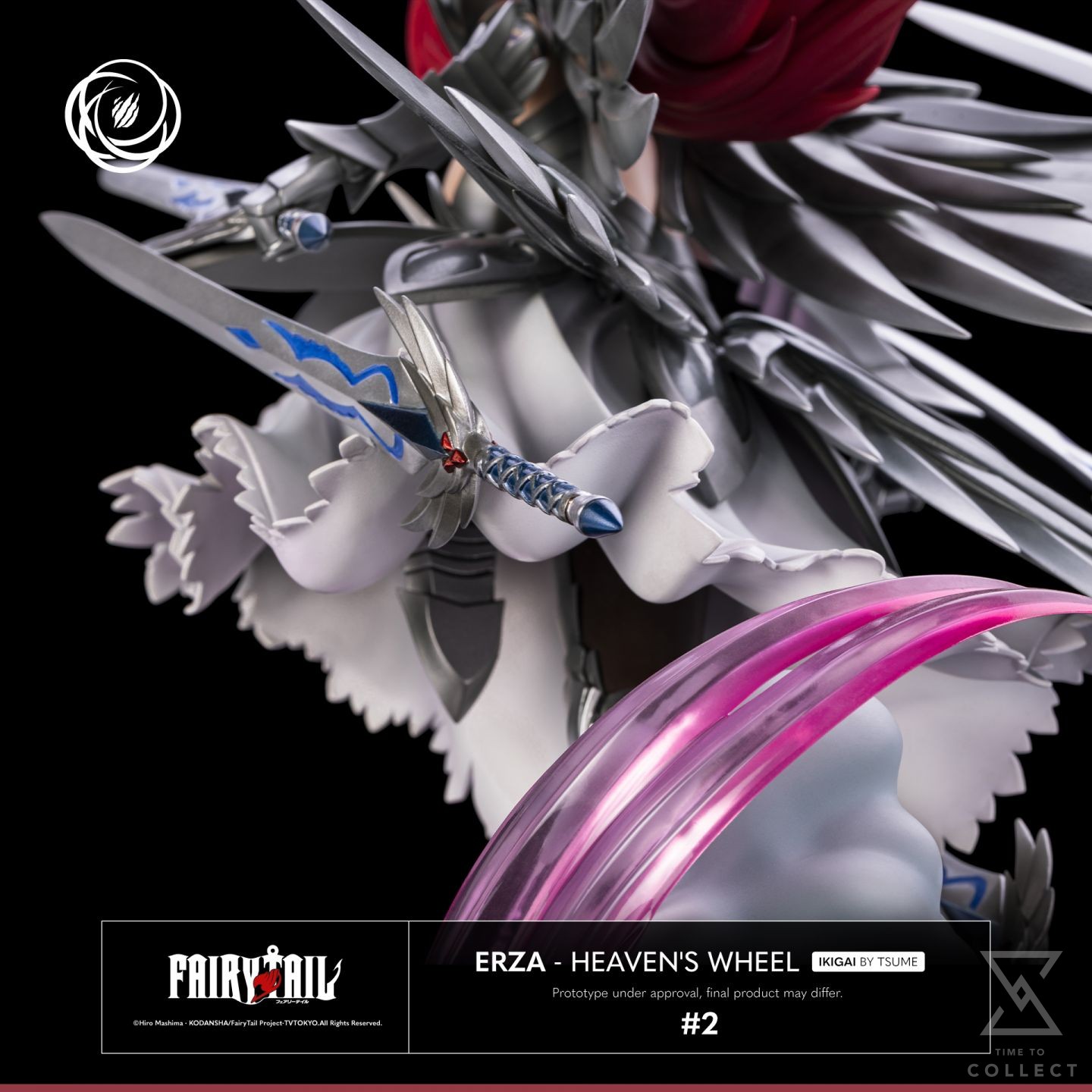 This Ikigai statue of Erza Scarlet emphasizes her conquering temper as she storms! The Fairy Tail’s S-Class Mage and 7th Master is the strongest and most respected woman in her guild and possesses unwavering determination, as evidenced by her fierce expression as she rushes headlong towards her foe, with her long scarlet hair thrown back! Thanks to her signature magic Requip: The Knight, Titania has a variety of magical armors, here wearing the Heaven’s Wheel one! Mostly in silver metal, plates like feathers protect her bust and mark her waist, with her high patched boots hidden under her white skirt. The straps covering her arms reveal her blue guild’s tattoo, completed by a neck protector and tiara with metal wings, wings found in life-size on her back so that the Fairy Queen can fly. Equipped with seven swords at her side, she uses her iron fist to eradicate any obstacle in her path, as evidenced by the energy effects in pink transparent resin and the dust rising brutally from the land she conquers!