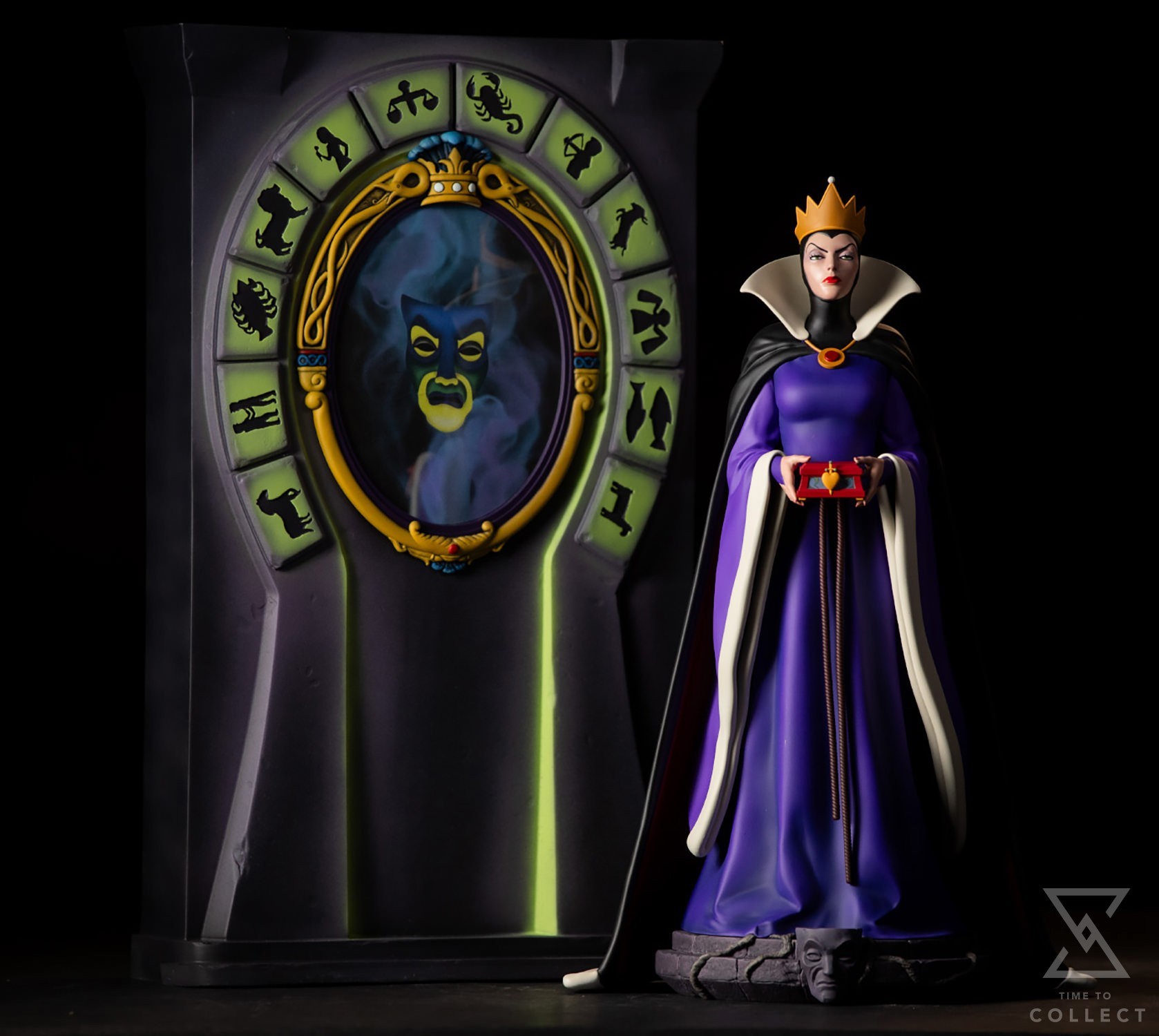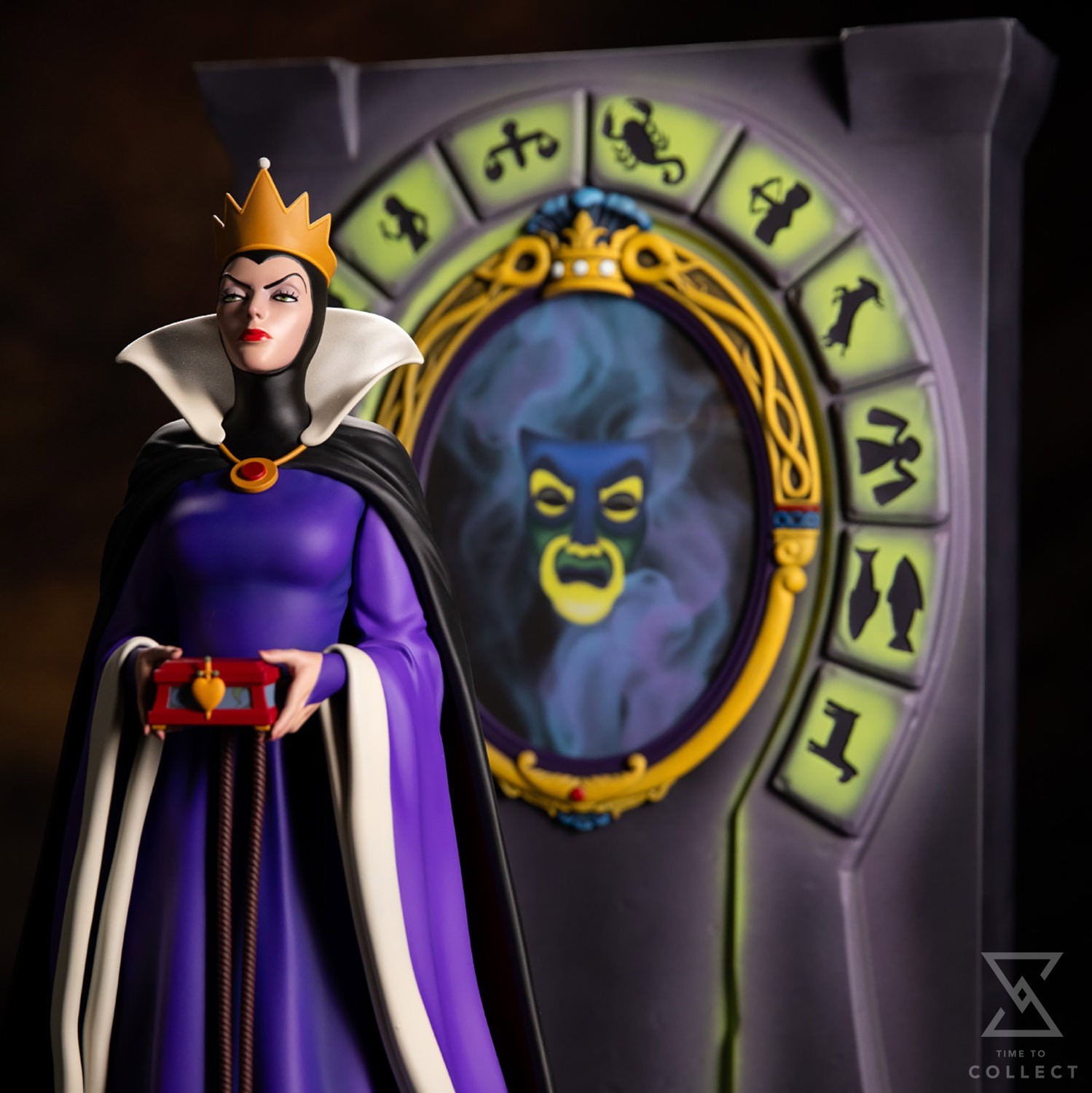 The Evil Queen 1:5 Statue stands nearly 16” tall and depicts the classic villain standing stoically with a malicious glare and a mysterious gift in her hands. She stands atop a medieval themed base adorned with withering vines and the eerie visage of the magic mirror.