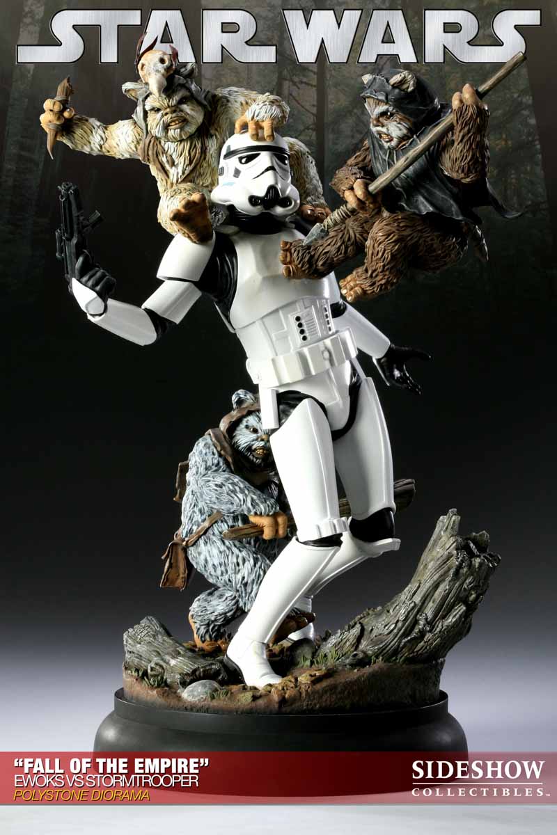 Sideshow Collectibles and Lucasfilm are proud to present the ‘Fall of the Empire’ – Ewoks VS Stormtrooper Diorama. Siding with the Jedi and the Rebel Alliance, the underestimated Ewoks ultimately overpower the Stormtroopers who attempt to invade the Endor forest. Each piece is individually painted and finished, each with its own unique quality and detail that is the trademark of a handcrafted Sideshow Collectibles product. This stunning piece will make an outstanding addition to any Star Wars collection!