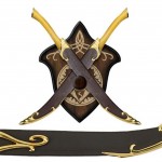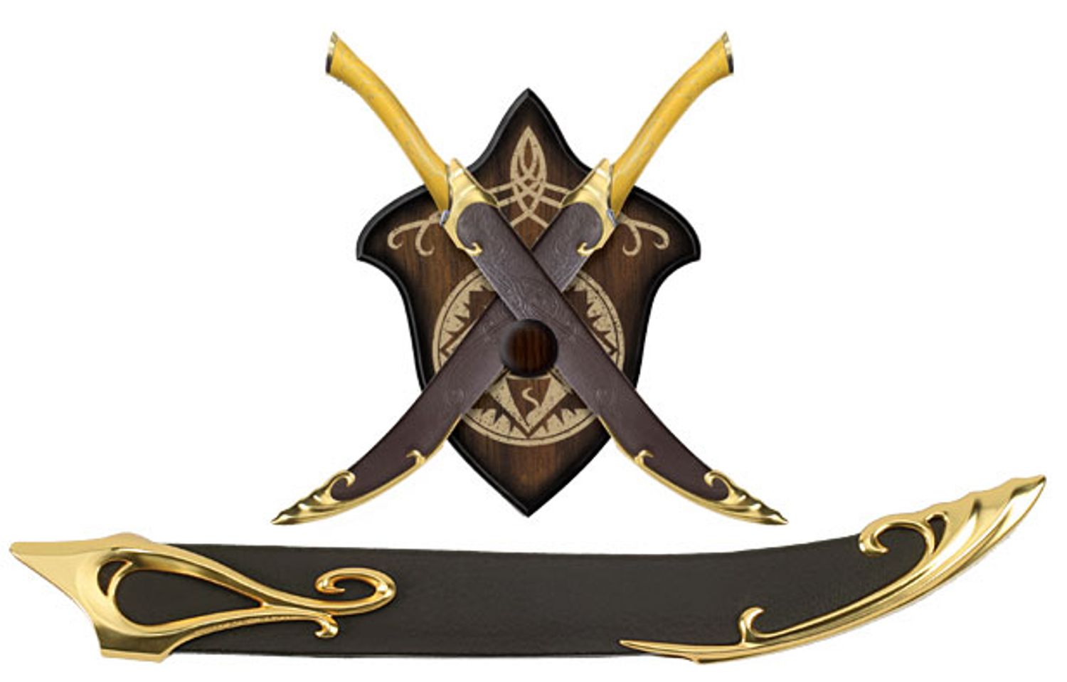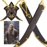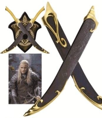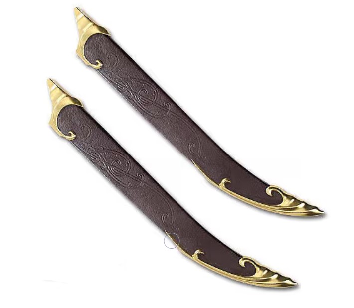 These authentically detailed scabbards are licensed reproductions of the brown leather fighting scabbards prominently featured in “The Two Towers” & “The Return of the King” motion pictures, presented by New Line Cinema. United Cutlery Brands, industry leader in fine movie knife and sword reproductions, has meticulously recreated the actual prop scabbards, using the finest grade materials and craftsmanship of the highest quality available. Features include genuine leather wrap, embossed with an Elven vine design, and solid metal collar and tip. Equally as skilled in the art of knife fighting as archery, Legolas used his fighting knives to defeat Orcs in close-range combat using his left hand as well as his right. Legolas fastened his knife scabbards to the arrow quiver on his back so he could quickly draw the knives over his shoulder.