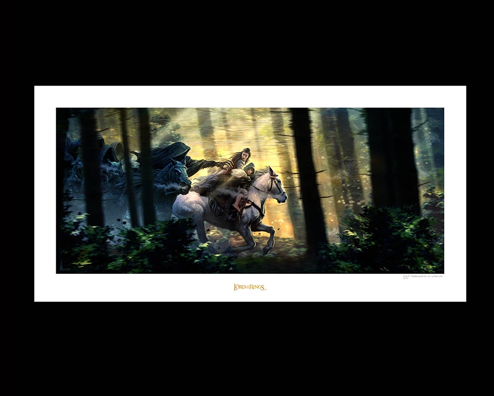 Borne swiftly upon Asfaloth’s back, Arwen Undómiel rides for Rivendell, the home of her father Elrond and Frodo’s last hope. Racing against time for the life that ebbs from the Ringbearer’s pierced and poisoned body with each hoof beat, the Elf maid makes for the Ford of the Bruinen with the Nine at her heels! Arwen’s pursuers are no ordinary riders robed in black, but the Nazgûl, the Ringwraiths, Sauron’s greatest servants, lead by the malevolent Witch-king whose jagged morgul knife drew the Hobbit’s blood, its tip breaking off to worm its enchanted way towards his heart. Only in Rivendell and by her father Elrond’s arts can his life be saved, if only she can reach the watchful water at the borders of his realm in time. One of the most menacing encounters with the Black Riders, the scene gets the adrenalin pumping in The Fellowship of the Ring.