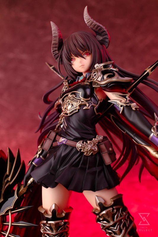The demonic girl stands ready to unleash destruction and take on any opponent in her ornate armor. Forte is posed with her feet spread wide for balance as she holds her massive lances out to either side. Her matching short black dress and armor are decorated with intricate gold designs, and the tatters of a red cloak swirl around her. Forte’s Skyrend Spears contrast beautifully, one black and the other white, both with gold details. The warrior woman’s unearthly origins are apparent in her large red eyes and the twin demon horns rising from her head while her long hair whips about behind her. Forte stands over 9 ½ inches tall (1/8 scale) on a stylish display base. This demon warrior will look great on her own or alongside other Rage of Bahamut statues from Kotobukiya like Spinaria and Little Queen Vania.