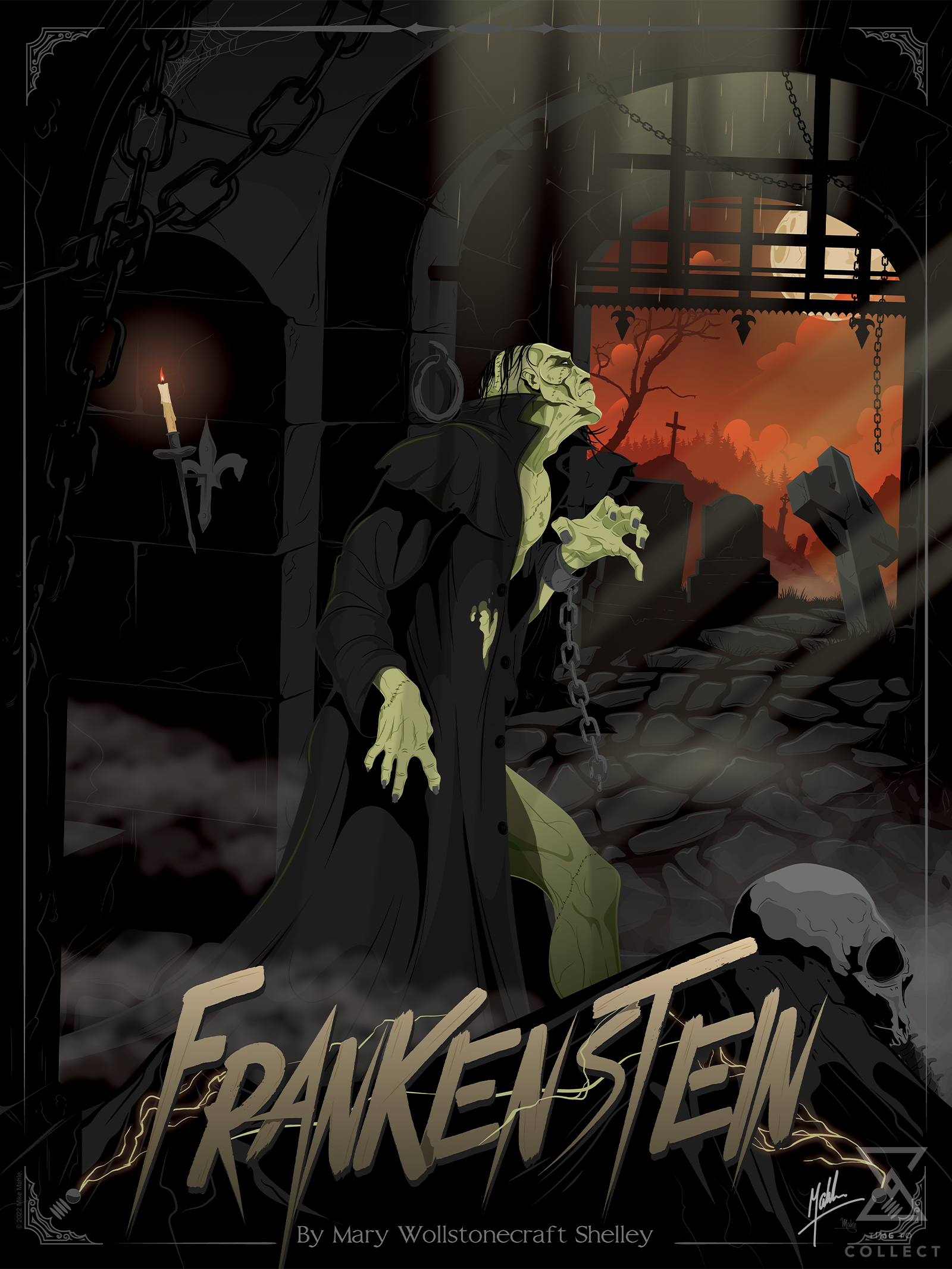 In a monstrous blend of scientific fact and horrific fiction, Frankenstein introduced the world to a tragic yet terrifying figure in its monster. Rejected both by his creator and crowds of fearful villagers, Frankenstein’s monster is a being of gruesome contrast; he represents both miraculous achievement and dreadful mistakes. In this vector art portrait, the pitiable creation looks from inside the dark charnel house of his creation towards a cemetery. He is shackled to death, built from it, and will someday return to its indifferent embrace.