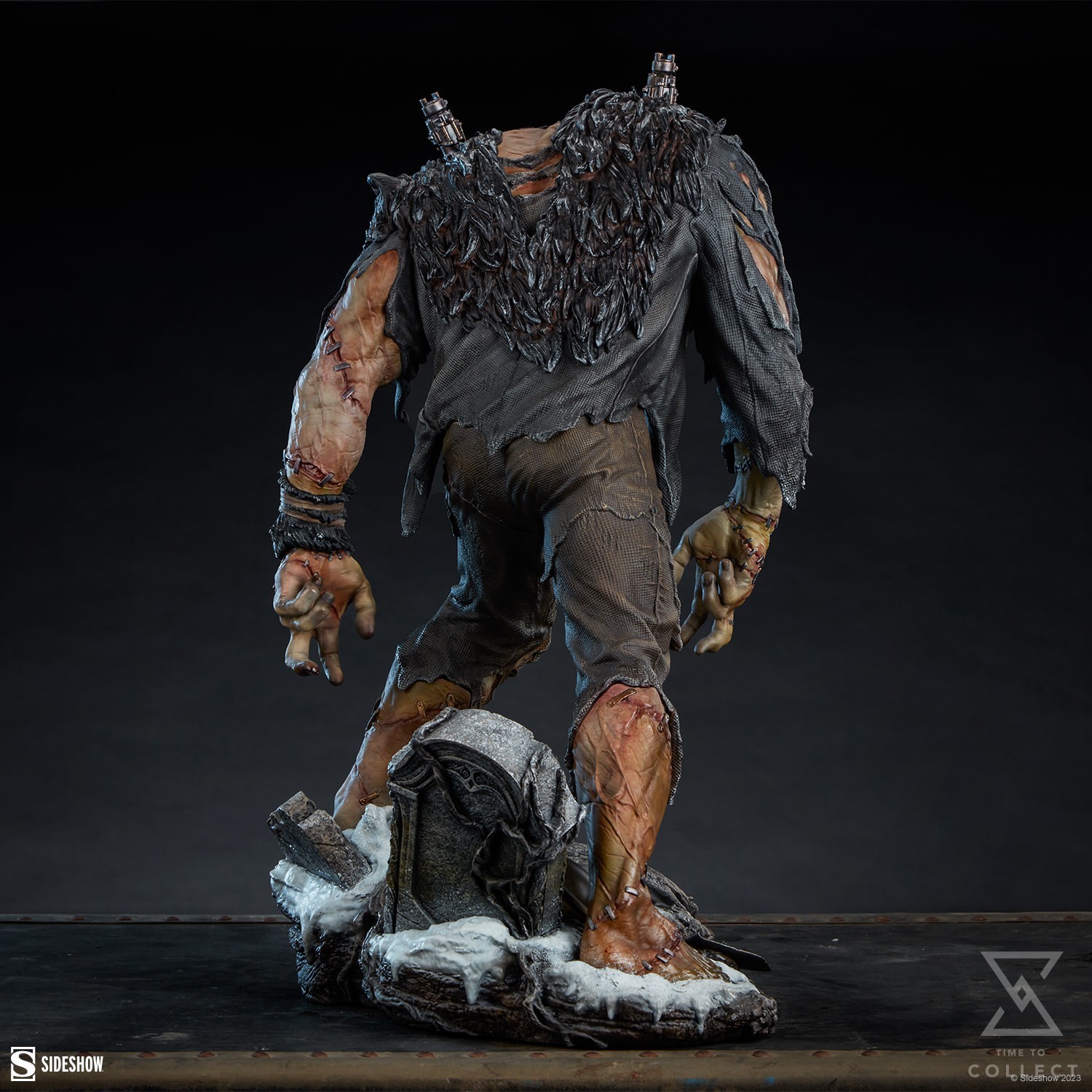 The Frankenstein’s Monster Statue measures 19” tall x 12” wide x 11.7” deep and is fully sculpted to capture all of the cadaverous detail of the hulking figure. Two large electrodes emerge from his back, which is cloaked in the pelt of a skinned black bear. Patchwork pants mirror the monster’s construction and silver staples hold his reanimated flesh together across every surface of his body. He is painted with a mixture of rotting yellows and irritated reds, emphasizing how Frankenstein’s creation straddles the line between life and death.