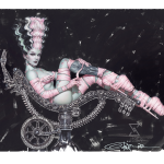 In this reimagined variant of Olivia’s original piece titled “Franky’s Bride,” mad science and sultry style combine in the laboratory to give a bizarre beauty new life! Model Tiah Eckhardt serves as the face of the iconic monstress as she removes her pink bandages to reveal the beauty of her creation. From the height of her hair to the stiletto heels, Frankie is drop dead gorgeous, boasting a tattoo of the mechanical woman Maria from Metropolis on her calf. The Body Snatcher chair beneath her is based on the captivating designs of artist Martin Meunier, making this beguiling bride truly the sum of her parts!
