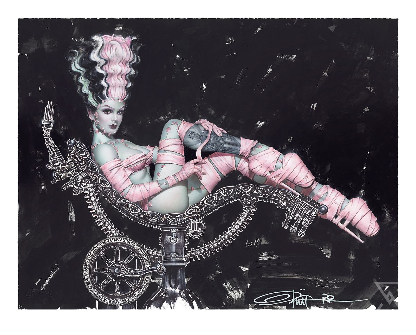In this reimagined variant of Olivia’s original piece titled “Franky’s Bride,” mad science and sultry style combine in the laboratory to give a bizarre beauty new life! Model Tiah Eckhardt serves as the face of the iconic monstress as she removes her pink bandages to reveal the beauty of her creation. From the height of her hair to the stiletto heels, Frankie is drop dead gorgeous, boasting a tattoo of the mechanical woman Maria from Metropolis on her calf. The Body Snatcher chair beneath her is based on the captivating designs of artist Martin Meunier, making this beguiling bride truly the sum of her parts!
