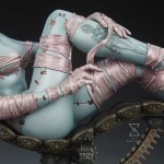 Frankie herself is based on the portrait of model Tiah Eckhardt and features incredible sculptural and painting details to bring this bizarre beauty to life. She is wrapped in glittery pink bandages, held together by rose gold staples and stitches. Her light green skin also has a pearlescent sheen to it, making her eye-catching from every angle. As she unwraps herself, a leg tattoo of Maria, the mechanical woman from Fritz Lang’s Metropolis, can be seen. Finally, Frankie has a few bolts tucked away in her heightened hair and a pair of pink platform pumps, making this monstress an irresistible sight from head to toe!
