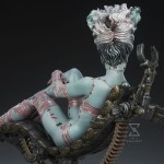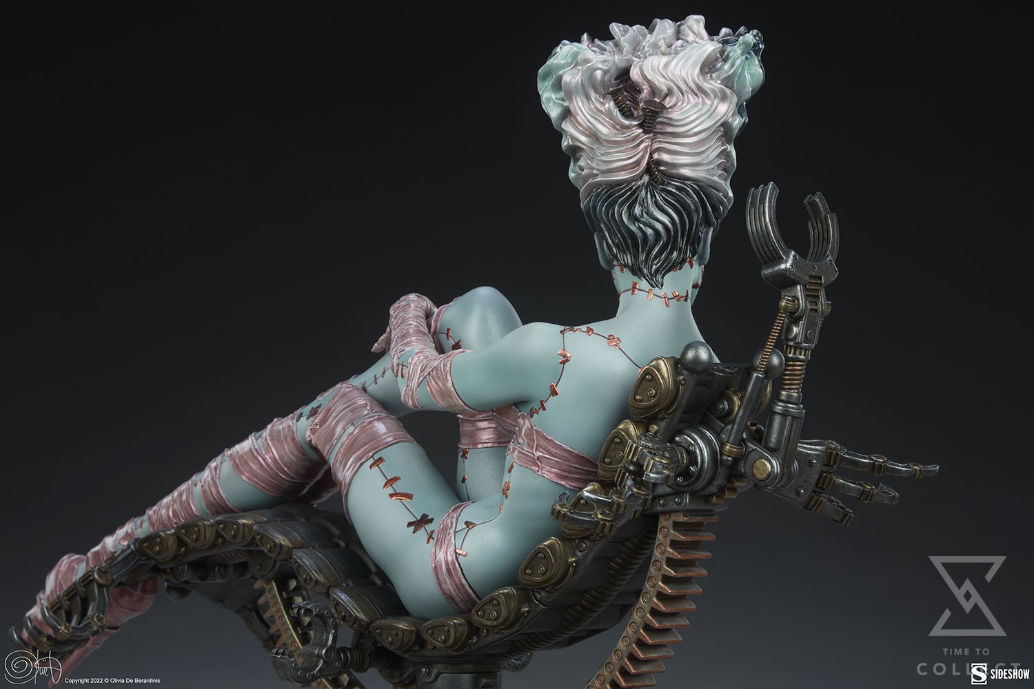An electrifying combination of death and beauty, the fully sculpted Frankie Reborn Statue truly is the sum of her parts! Measuring 16.5” tall and 17.3” wide, this reanimated bride reclines luxuriously in the lap of the Body Snatcher, an original chair sculpture invented by artist Martin Meunier. Its mechanical, mad science design contrasts perfectly with the soft, curvaceous cadaver removing her pink bandages to reveal the brilliance of her creation.