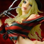 Kotobukiya brings a bold new direction to their popular series of Bishoujo Statues with the Freddy Krueger Bishoujo Statue. Based on a new character interpretation by master illustrator Shunya Yamashita, Freddy wears Freddy Krueger’s iconic sweater, hat, and bladed glove. Whether in your dreams or in your nightmares, this Bishoujo statue is sure to make a big impression with her great looks and blood colored base. Standing 18 cm (over 7 inches) tall in 1/7 scale, Freddy is a great addition to your Bishojo collection. Freddy makes for a screaming display on her own, and looks even better alongside the Jason bishoujo! The reproduction version includes a renewed statue base and package design.