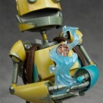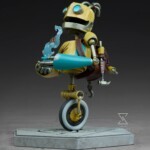 The Fresh Cut Grass – Bells Hells Statue stands on a hexagonal faux-stone base engraved with the Bells Hells monogram, complementing other characters coming soon to the collection. His whimsical robotic design is finished with sculpted wires tied together at the top of his head, yellow and blue plating accented with four red chest stripes, and a traveler’s pack stocked with tools like a hammer, hook, rope, and his saw arm attachment.