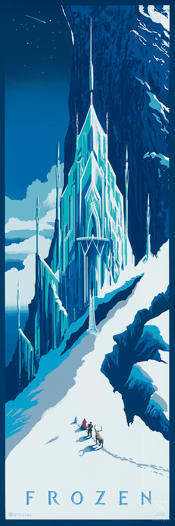Traverse the North Mountain towards Elsa’s ice palace with Olaf, Anna, Kristoff, and Sven in this beautiful Disney fine art print. Each 22-color screenprint includes a Certificate of Authenticity from a hand-numbered limited edition of 250 pieces.