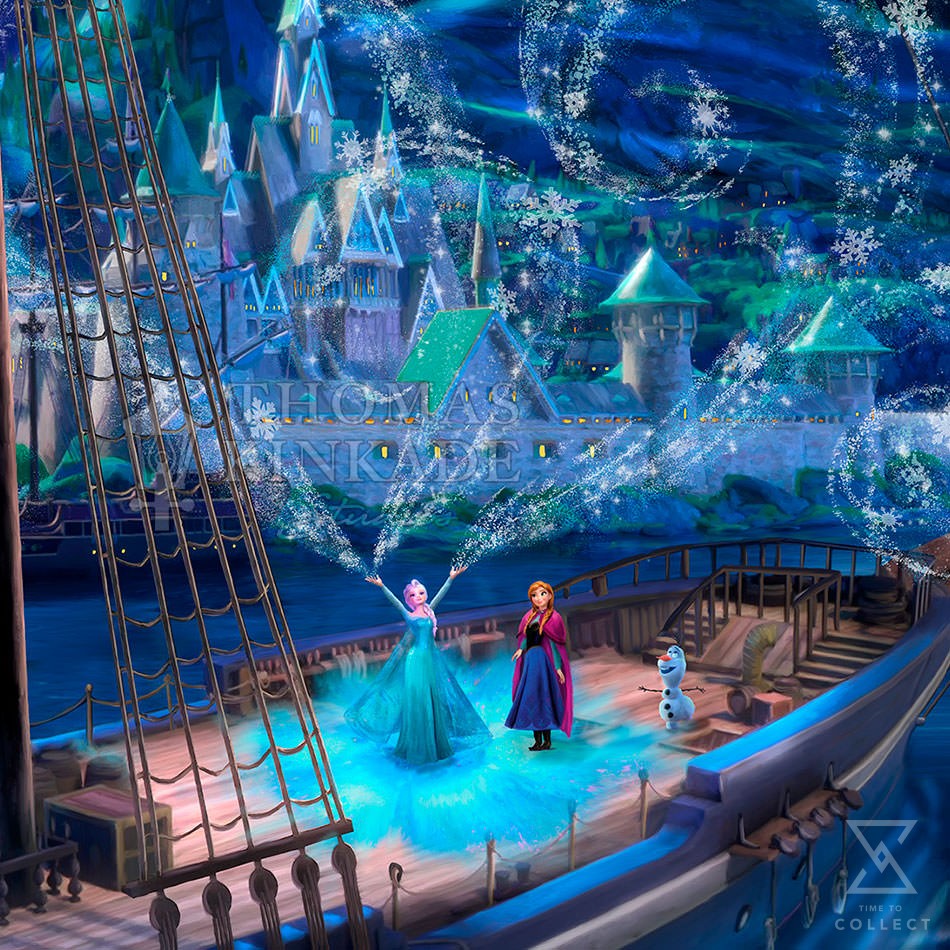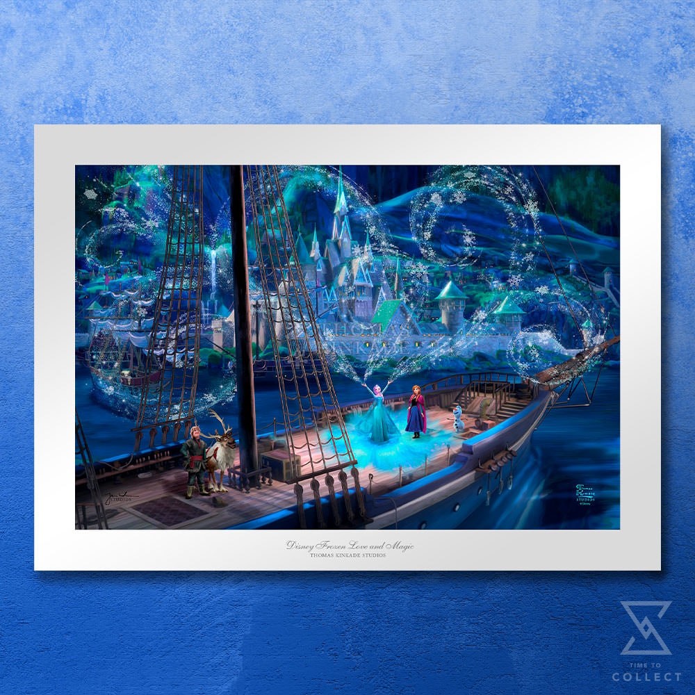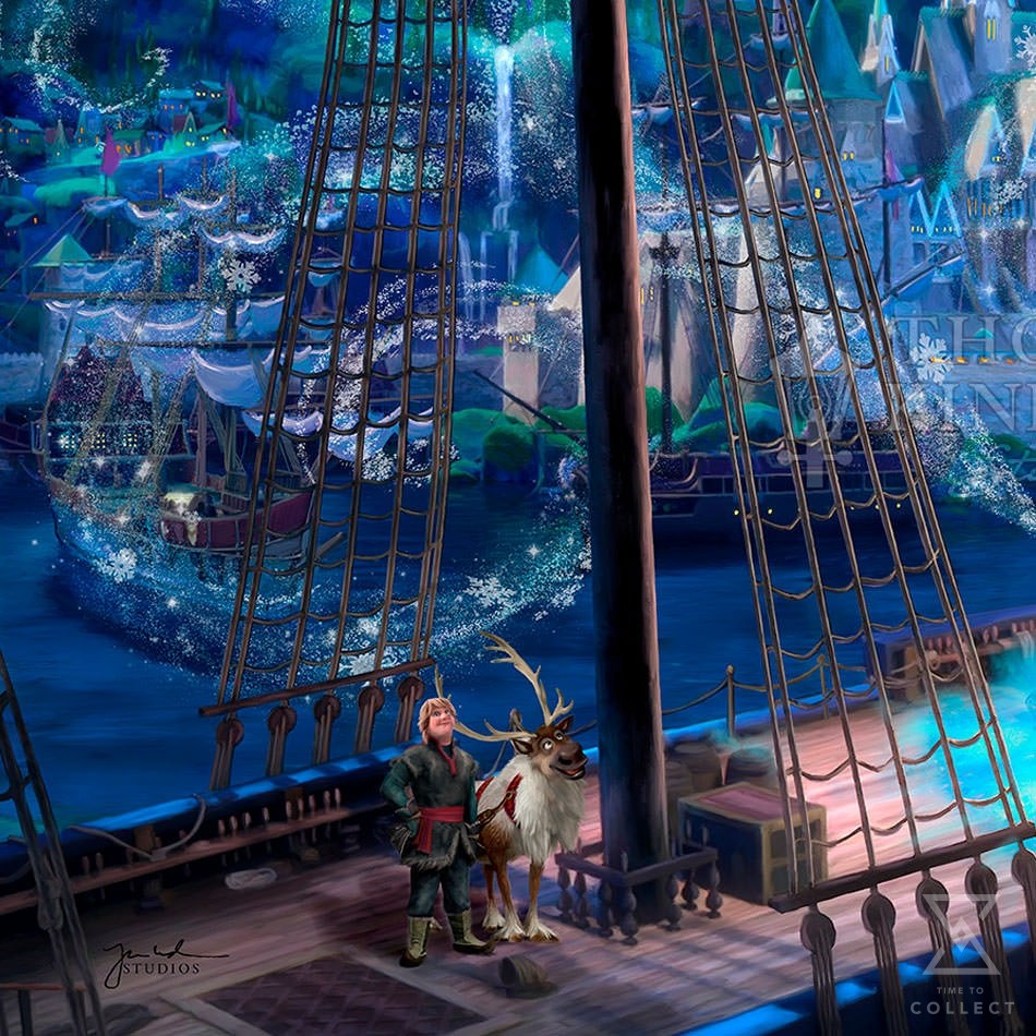 In Disney’s Frozen, the magical kingdom of Arendelle comes alive with enchantment and wonder. Elsa, gifted with the power to create ice and snow, has learned to embrace her abilities and use them to bring joy to her kingdom. Her sister, Anna, stands by her side, their bond stronger than ever. Together with Kristoff, Sven, and the ever-cheerful snowman Olaf, they embark on a magical journey that celebrates the power of love, family, and self- acceptance. As night falls on Arendelle, the harbor transforms into a breathtaking spectacle of glittering magic. Elsa’s powers swirl through the air, creating dazzling streams of snowflakes that dance around the majestic ships. The castle in the background glows with warm light, a beacon of hope and home. Anna and her friends stand in awe on the deck of a grand vessel, witnessing the extraordinary beauty of Elsa’s magic display. Thomas Kinkade Studios is pleased to present Disney Frozen Love and Magic.