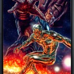 The universe will never be the same. Galactus, the most formidable being in the cosmos, sends forth the Silver Surfer to proclaim his master’s intent. Fire consumes everything below a star-studded purple sky, illustrating Galactus’ ability to devour planets. As Norrin Radd becomes Galan’s death knell, he races across the doomed planet’s surface — both victim and villain in an endless cycle of destruction.