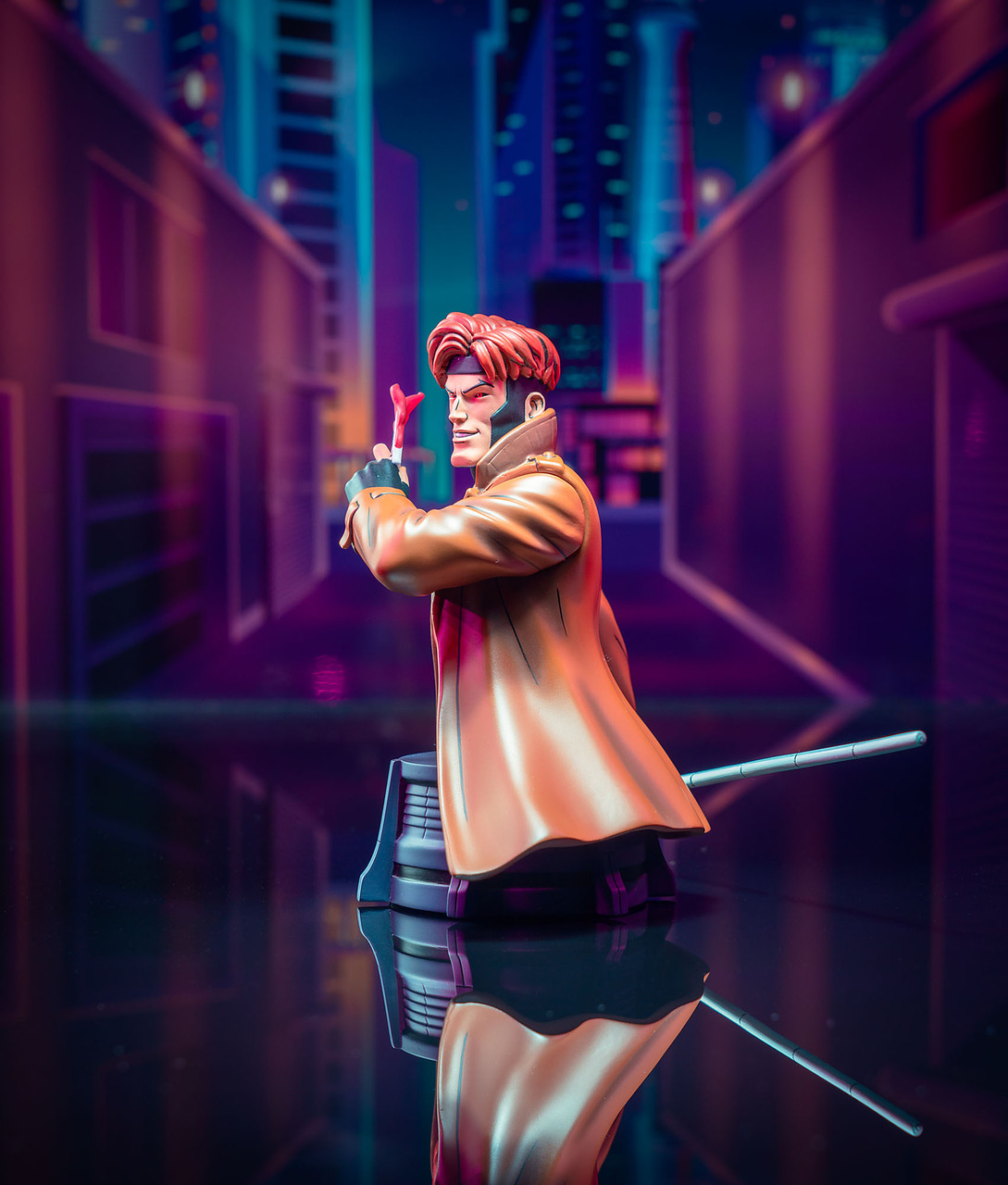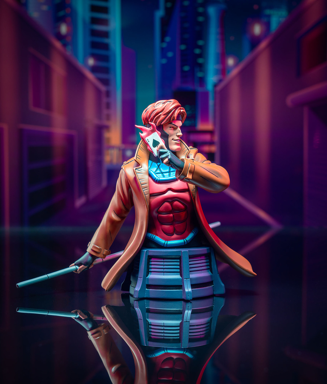 Based on the original X-Men animation from the 1990s, this approximately 6-inch bust of Gambit is inspired by his appearance in the series, wielding his staff and playing cards. Featuring a cartoon-accurate paint scheme and line-perfect sculpting, this bust is limited to only 3,000 pieces and comes packaged with a certificate of authenticity in a full-color box. Designed by Barry Bradfield, sculpted by Paul Harding.
