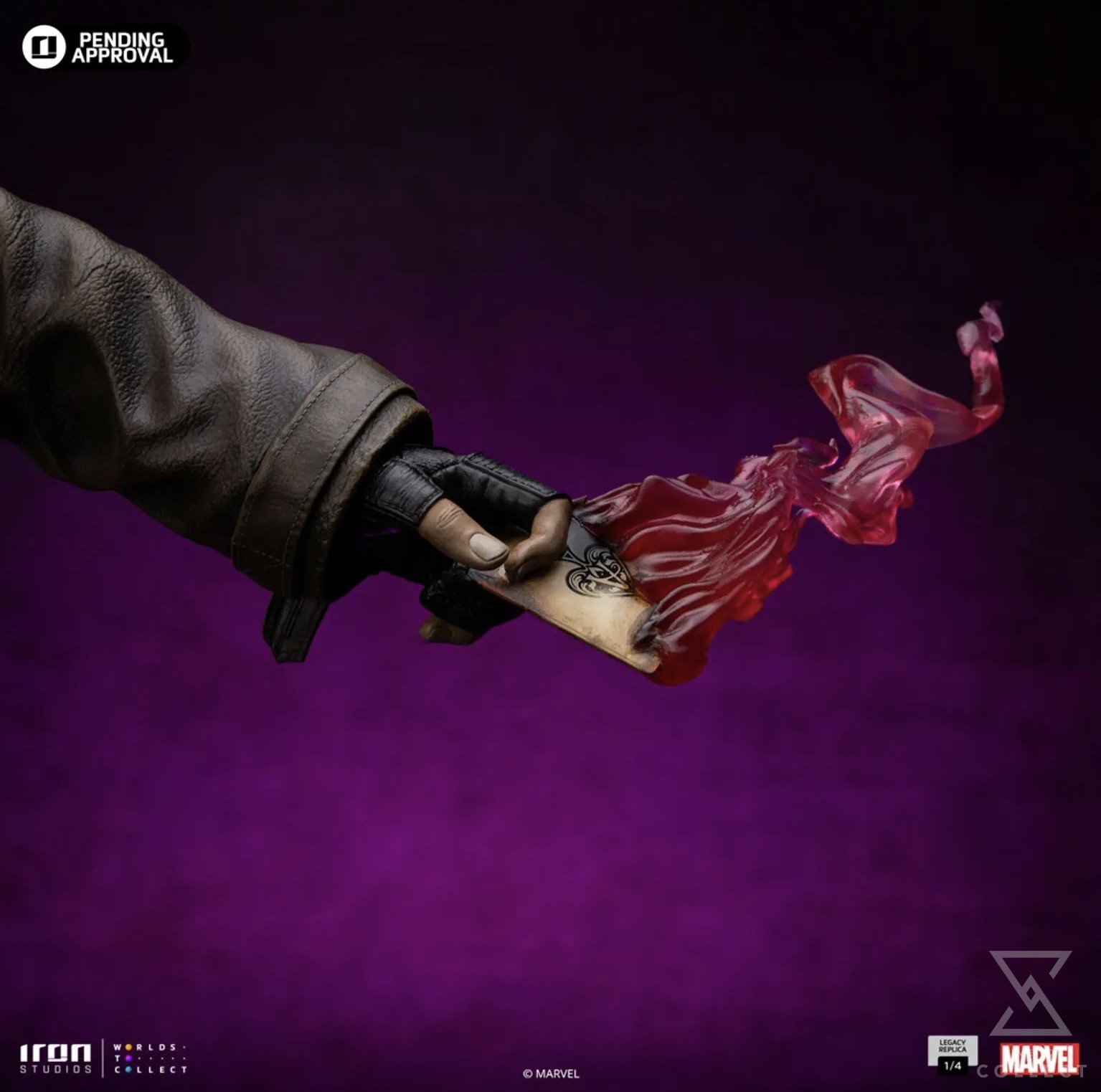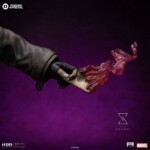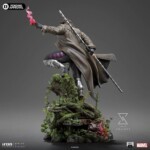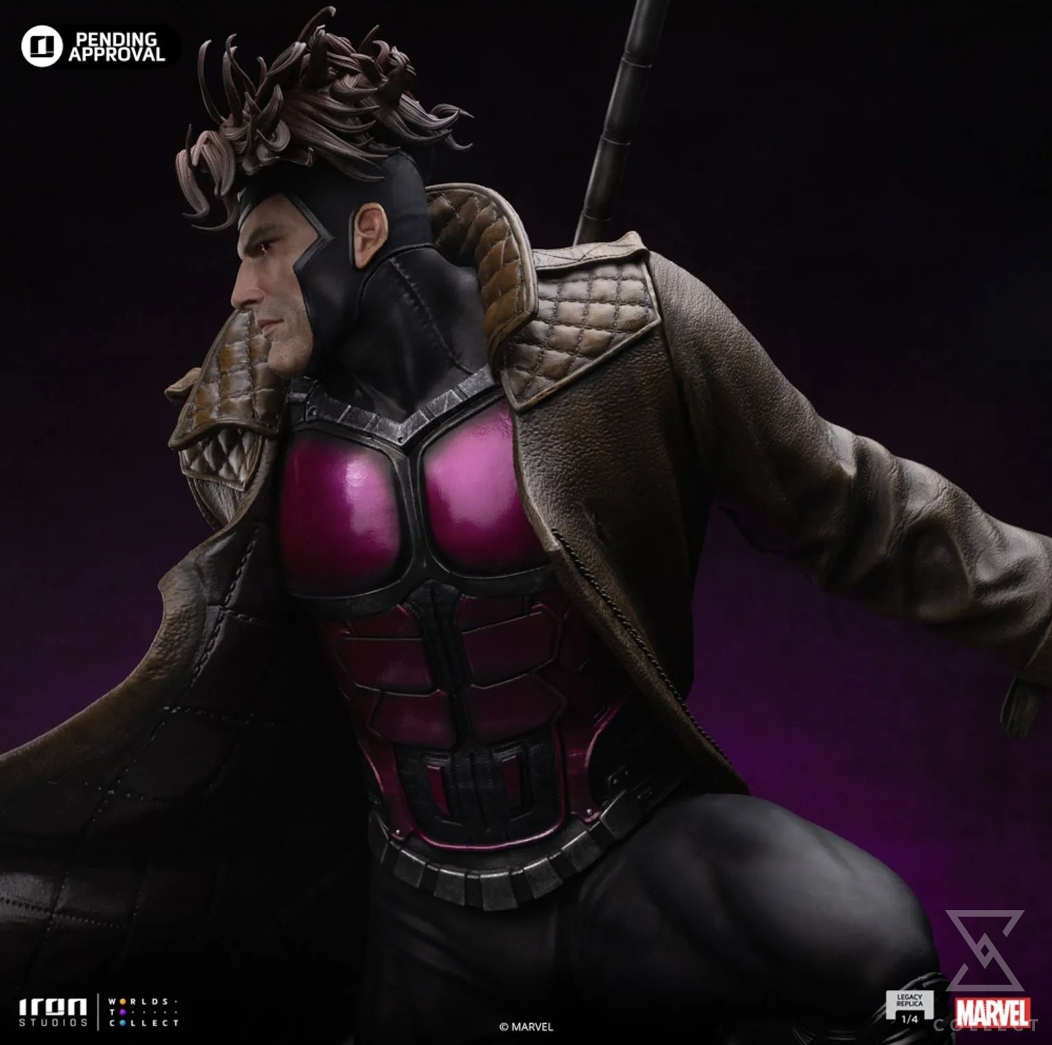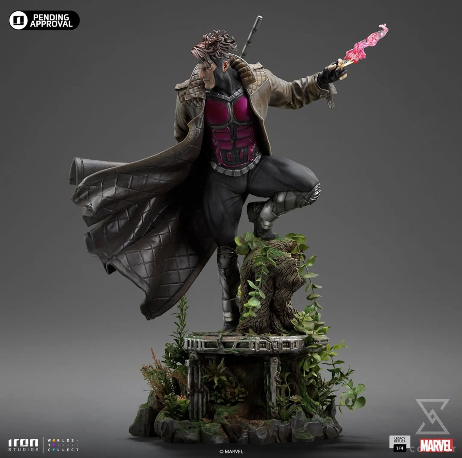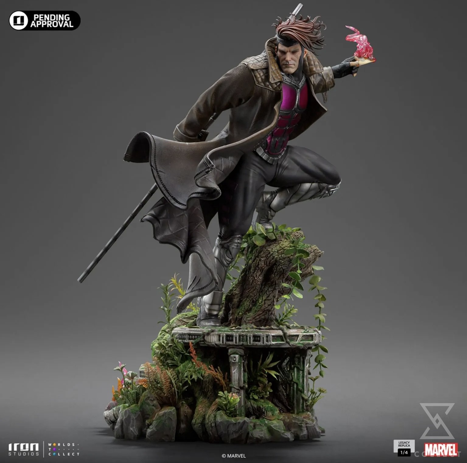 On a small platform inserted in the dangerous jungle of the hidden world known as the Savage Land, the Cajun mutant with a French accent from New Orleans, Louisiana, stands on rocks and beautiful vegetation, scaling the remains of a tree trunk and roots, surveying the battlefield with his striking eyes of black sclera and purple irises. Endowed with superhuman agility, balance, endurance, reflexes, speed, and enhanced strength, he is an excellent fighter, skilled in Savate (French boxing), Kickboxing, Karate, Taekwondo, and Bōjutsu, the art of using a Bō staff, his favorite weapon which he carries in an extendable version securely leaning on his right arm. With his primary power of molecular acceleration through touch, capable of vibrating his molecules, producing kinetic energy, creating his characteristic explosive cards, he holds a charged card in his left hand, emanating energy and ready to be thrown. Wearing his black, silver, and purple tactical uniform, covered by his inseparable trench coat, Iron Studios proudly presents its statue “Gambit – X-Men Comics – Legacy Replica 1/4”, the second future release of an X-Men hero in the Legacy Replica 1/4 line, soon to be joined by Dr. Hank McCoy, better known as The Beast.