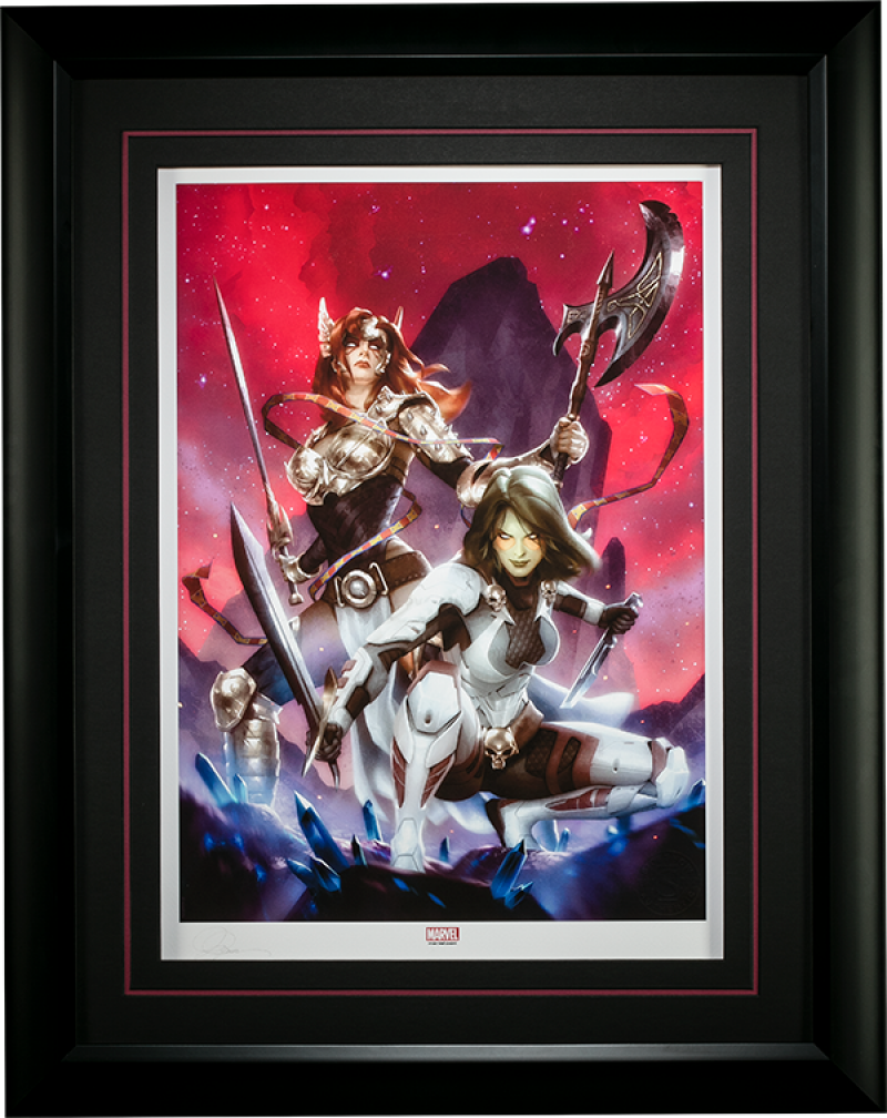 ONCE MORTAL ENEMIES, THE HUNTRESS OF HEVEN AND THE DEADLIEST WOMAN IN THE GALAXY HAVE TAKEN UP ARMS AND JOINED FORCES IN SIDESHOW’S NEXT OFFICIALLY LICENSED PREMIUM ART PRINT, ANGELA & GAMORA BY ALEX GARNER. LIMITED TO JUST 225 PIECES AND HAND-SIGNED BY THE ARTIST, THIS FANTASTIC ARTWORK WILL MAKE AN OUT OF THIS WORLD ADDITION FOR ANY GUARDIANS OF THE GALAXY OR MARVEL COLLECTION.