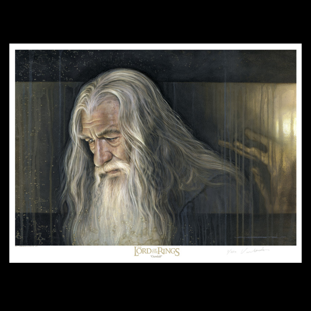 This beautiful PAPER GICLEE is printed using the finest materials available, utilizing archival inks as well as Breathing Color’s “Elegance Velvet” Fine Art paper. It comes signed and numbered by the artist with a Certificate of Authenticity. Gandalf comes in a Limited Edition of 250.