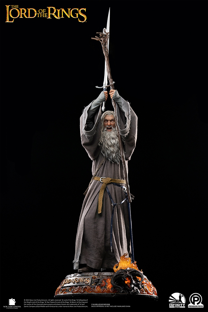 The second half scale with full-body statue of “The Lord of the Rings,” the wizard Gandalf is coming. The Fellowship is beginning to take shape. The Gandalf the Grey (Premium Edition) Statue belongs to the 1/2 Scale Master Forge Series, where Infinity Studios and Penguin Toys adopted the iconic character to a half-scale but with a full body of exquisite details delicately and lovingly restored, giving this item the ultimate presence. It is designed to meet the desire of collectors to pursue the ultimate class in their The Lord of the Rings collection. 1/2 Master Forge Series statues are equipped with NFC chips that collectors can touch with their NFC-enabled phones to unlock more information and create even more possibilities. This statue approximately stands at an impressive 61.42″ tall from base to the tip of the blade Glamdring and features a PVC-molded head piece with meticulously-detailed, sculpted hair. The portrait details the folds and wrinkles on the face, making Gandalf’s age more vivid. The dramatic expression conveys the determination and courage of Gandalf when he fought against the demon Balrog.