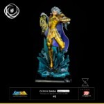 Meet Gemini Saga Ikigai, the Gemini’s Gold Saint also known as Pope Ares, in the Sanctuary Arc as he greets Seiya in the Pope’s room, attempting to help him saving Athena. But it will be without counting on his dark side! His white hair and bloodthirsty gaze indicate that his actions are now dictated by the evil part of his mind. Transforming him into a Machiavellian tyrant, he is propeling the transparent resin ball of energy contained in his right hand intended to destroy Seiya. The Saint is protected by the Gemini Cloth with golden and metallic reflections, representing the constellation Gemini, in reference to the Dioscuri twin brothers Castor and Pollux, sons of Zeus. Under the force of his assault, the temple slabs shatter, while the colors and textures of the decor and the collapsing column behind him echo the Sanctuary and Gemini Temple, where he intends to quench his thirst for chaos …