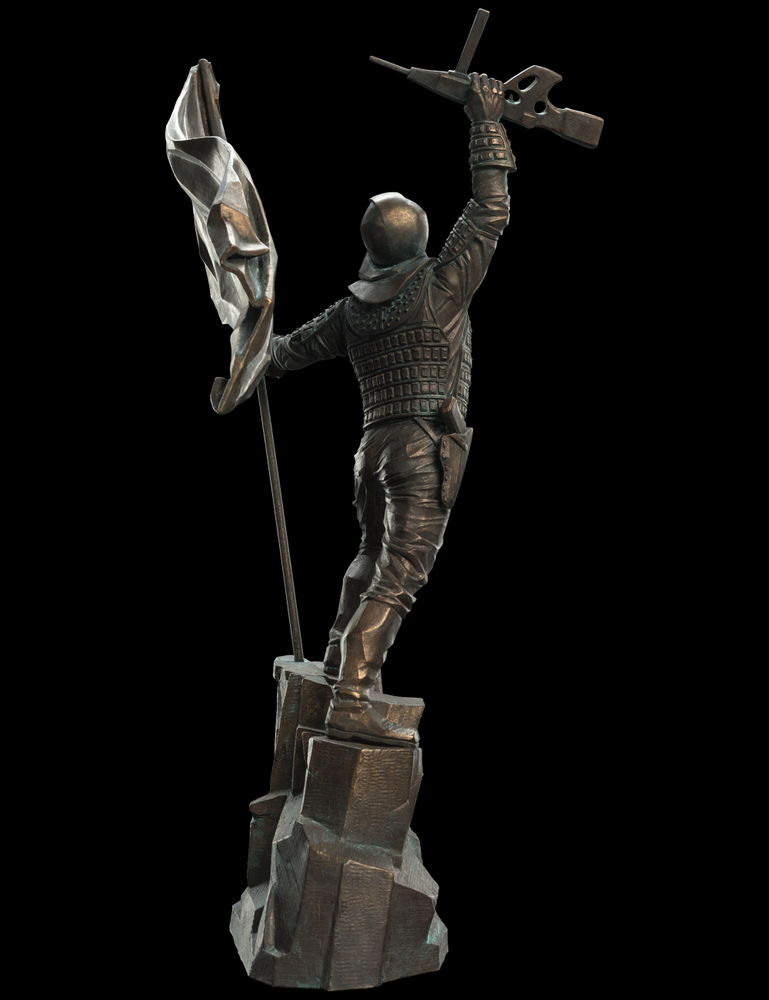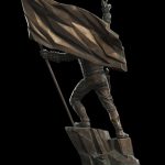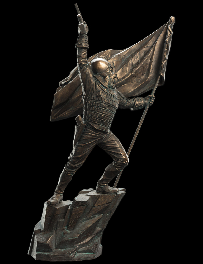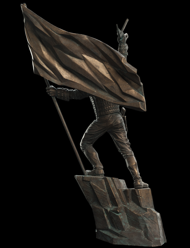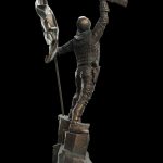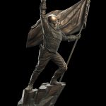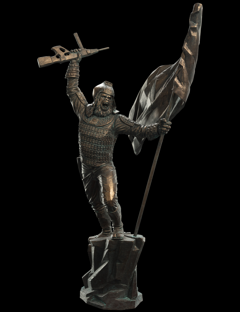 General Ursus is one such ape. Ursus stands atop his mound and issues his battle cry to INVADE. The Gorilla army must march to the Forbidden Zone, wage war with the surviving humans, and claim the settlements and food supply for their own. With territorial flag in-hand and a rifle raised above his head, General Ursus’ pose resembles that of the Statue of Liberty, whose shattered remains appear in the first film. Whilst the torch is a symbol of enlightenment, the General’s gun represents war and the destruction of humankind. After all, according to Ursus, “the only good human is a dead human.” The General Ursus 1:6 scale faux bronze statue is created to celebrate 50 years of The Planet of the Apes and pays tribute to an iconic character from the original film franchise.