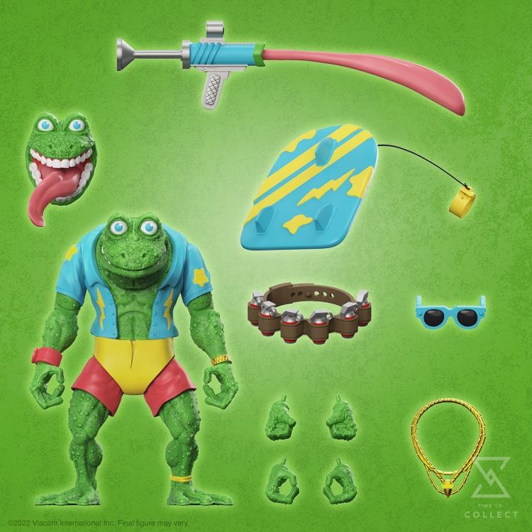 This 7” scale highly articulated Teenage Mutant Ninja Turtles ULTIMATES! Genghis Frog figure comes with interchangeable heads & hands and a variety of other accessories, including his Tongue Gun, boogie board, and more. Make the leap and secure your made-to-order Genghis Frog ULTIMATES! Figure!