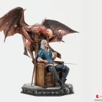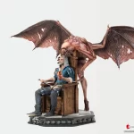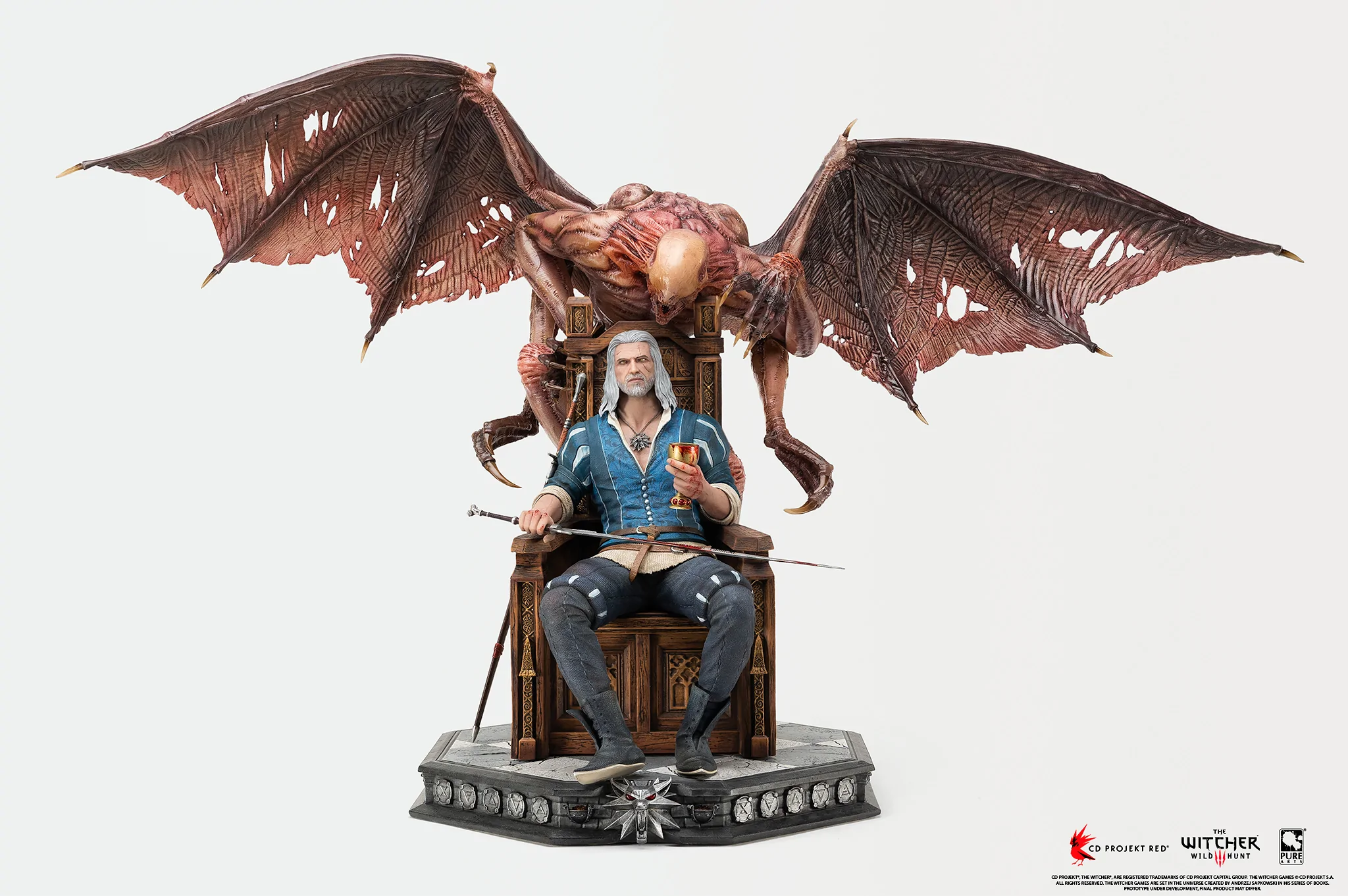 PureArts is proud to bring the stunning Blood & Wine cover art to life with one of our largest and most impressive statues to date! Surmounted by the High Vampire Dettlaff with a spectacular 42 inch wingspan (over 1 meter), Geralt of Rivia gazes intently from his throne and gripping a bloodied chalice in one hand, his enhanced griffin silver sword in the other.