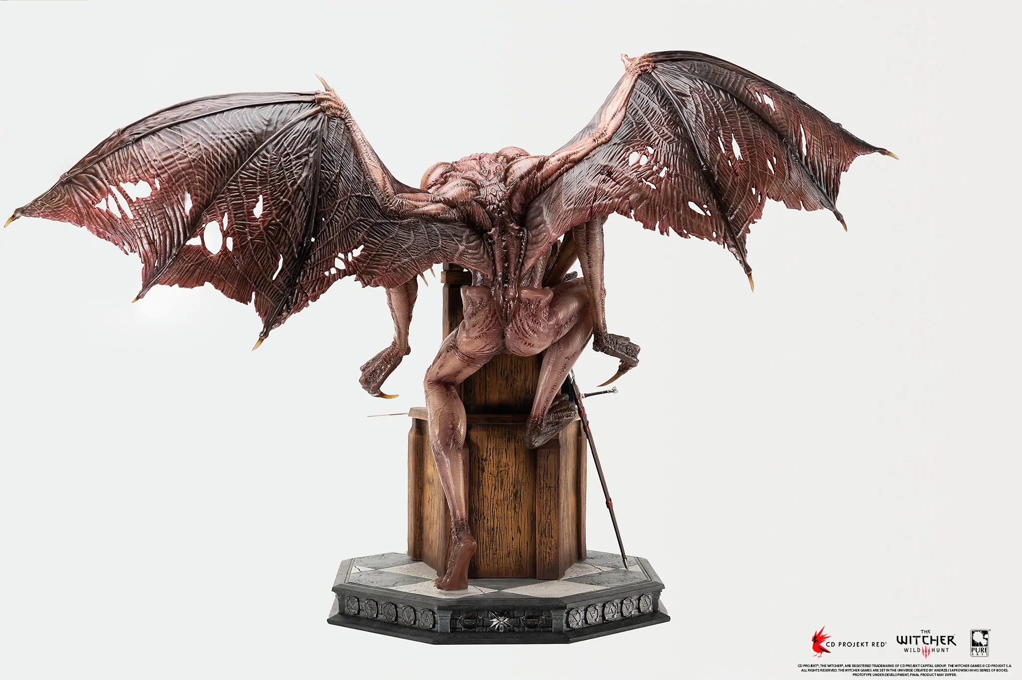 PureArts is proud to bring the stunning Blood & Wine cover art to life with one of our largest and most impressive statues to date! Surmounted by the High Vampire Dettlaff with a spectacular 42 inch wingspan (over 1 meter), Geralt of Rivia gazes intently from his throne and gripping a bloodied chalice in one hand, his enhanced griffin silver sword in the other.
