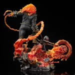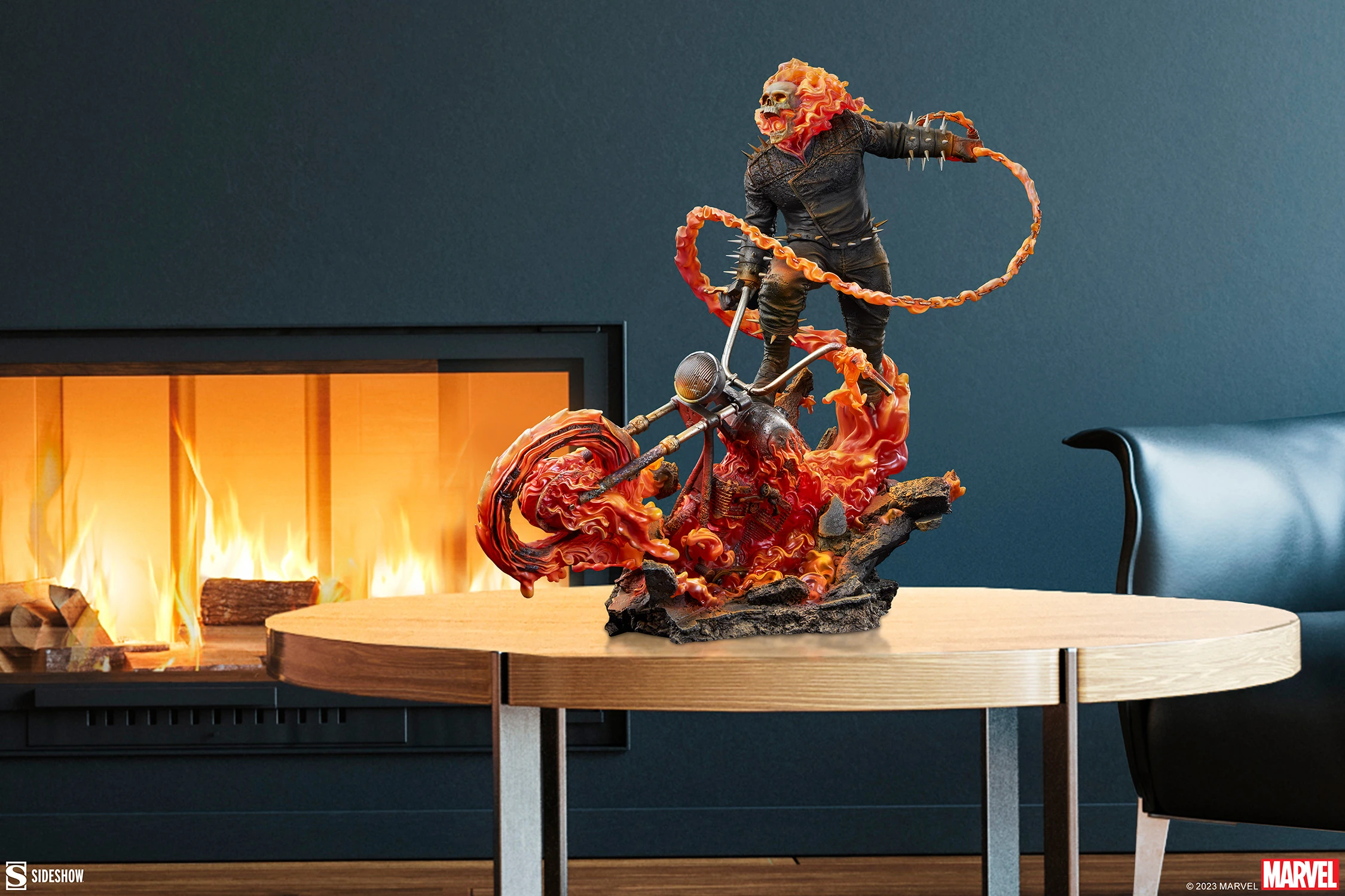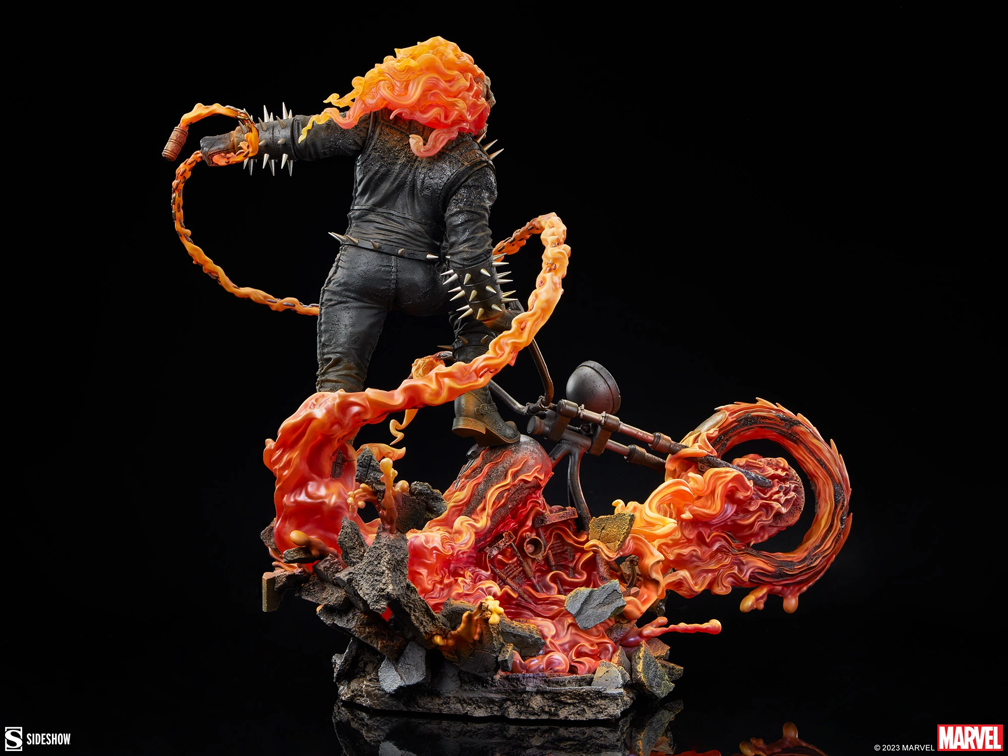 The battle is getting heated as this skull-faced antihero prepares to put sinners in the hot seat. The Ghost Rider Premium Format™ Figure measures 21” tall x 14” wide x 24” deep as the brimstone biker erupts from the ground, riding his flaming Hell Cycle and swinging his blazing chain whip to deliver burning retribution. This massive display of dynamic action has translucent flames and detailed paint application that gives the impression of overheating metal.